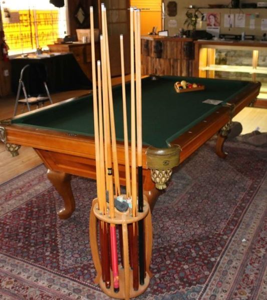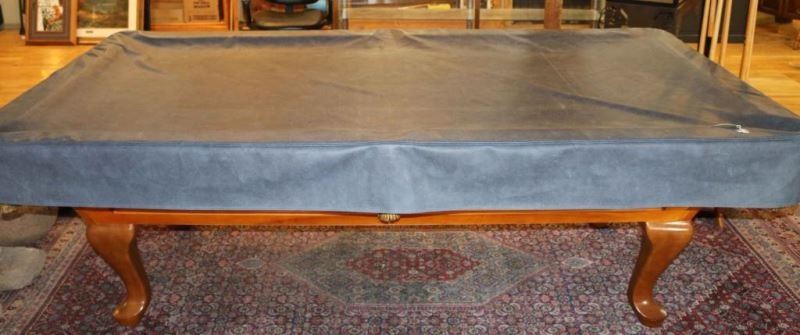 Certified Diamond Honed Slate billiards table. Wood construction with curved legs, green felt playing surface with inlaid mother of pearl diamond side markers and leather net pockets. Measures 8'l x 54"w x 32"h. Comes with all balls, rack for holding cues, ball rack and nine cues in various sizes and a gray vinyl cover.