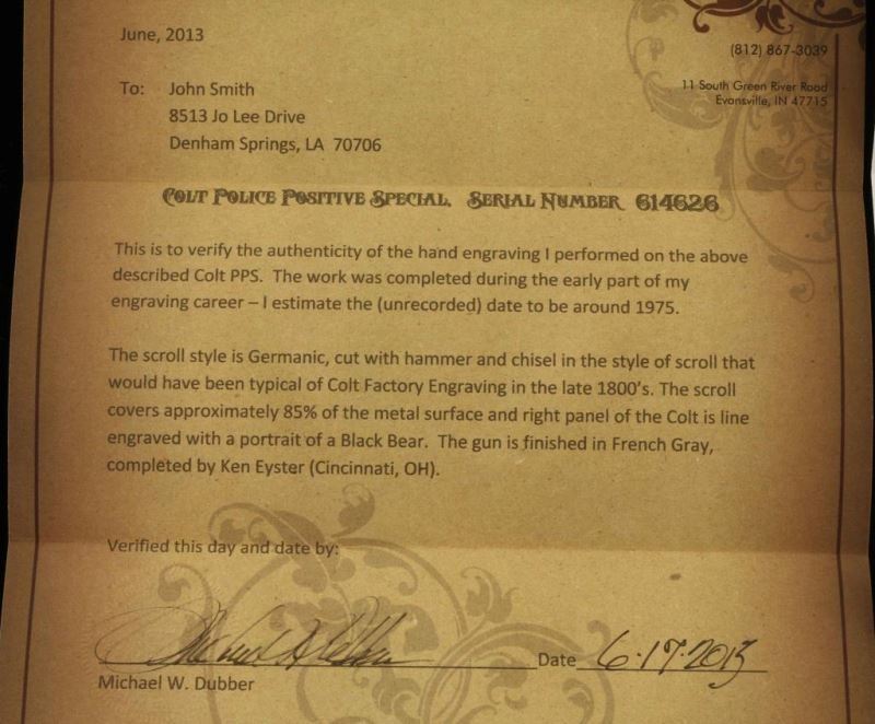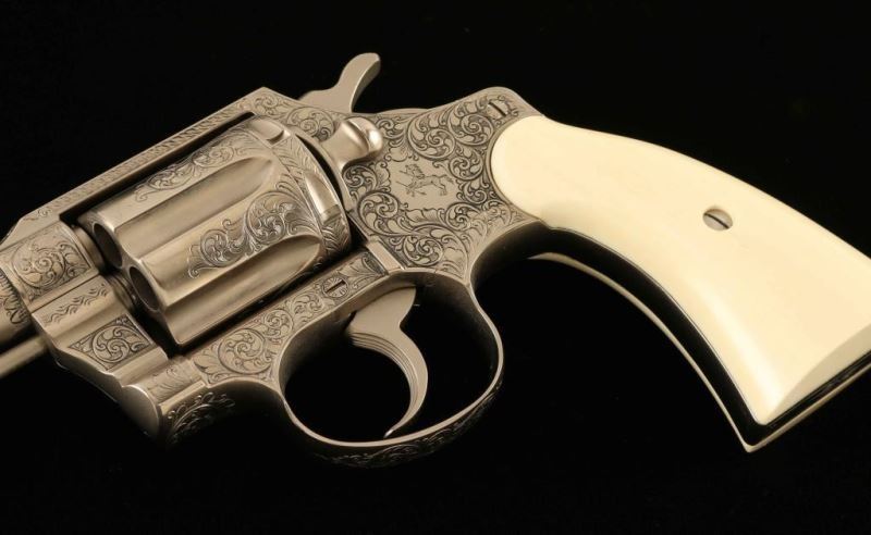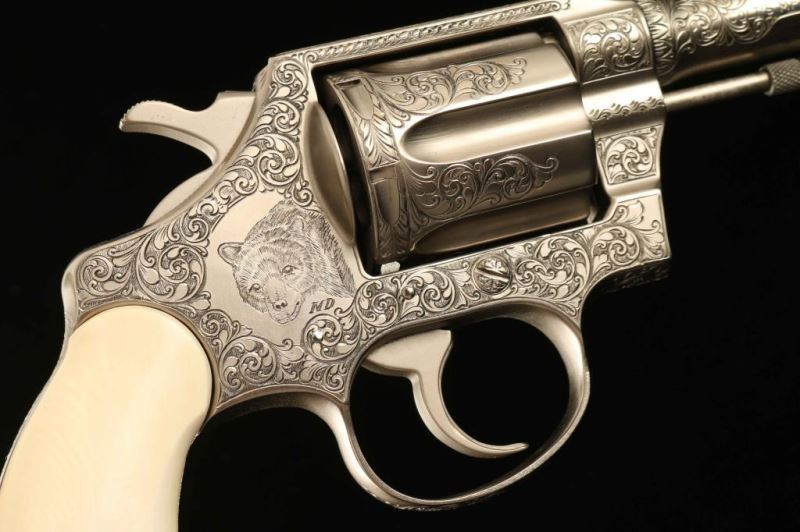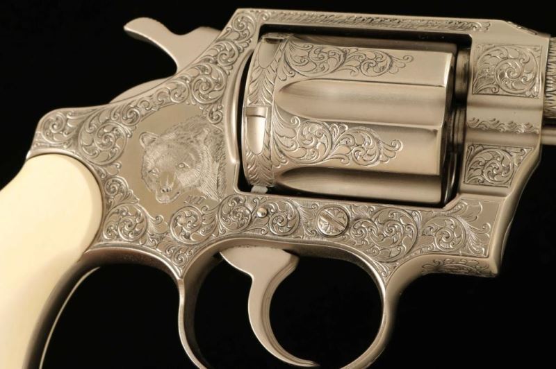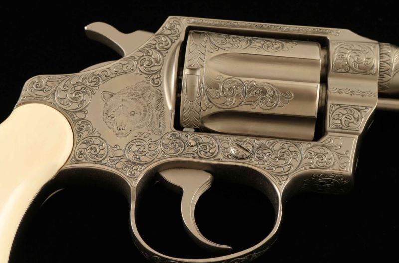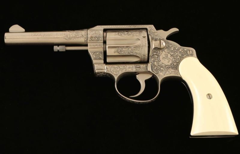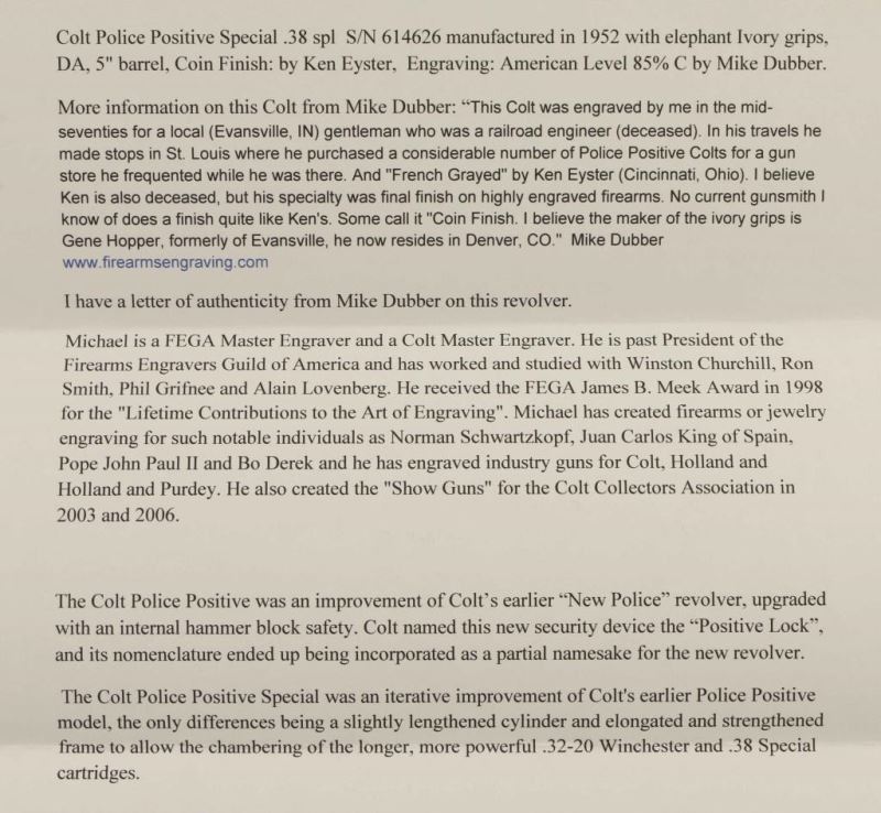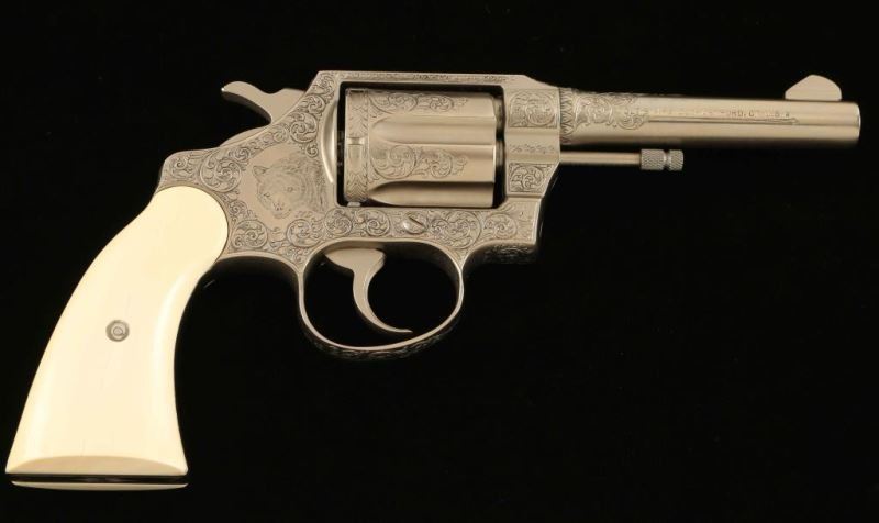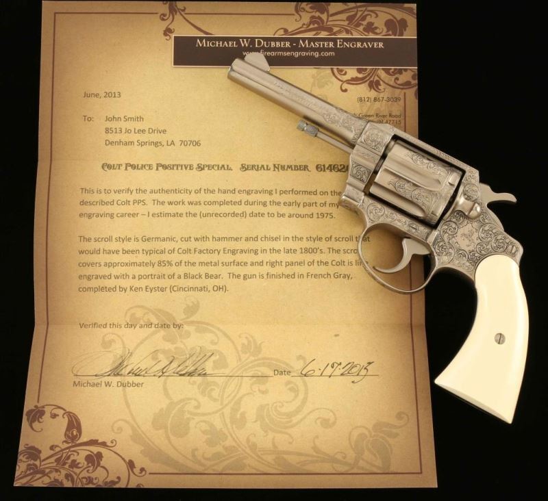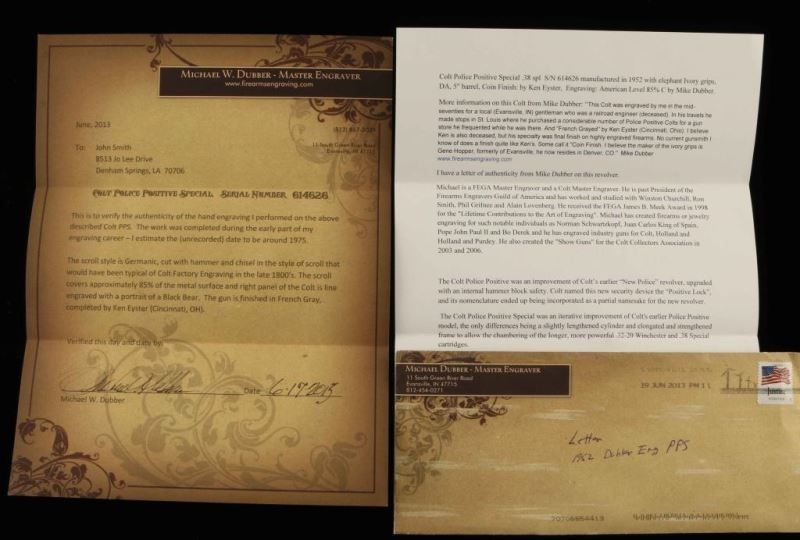 SN: 614626 Magnificently engraved & restored vintage double action revolver chambered in .38 Special, manufactured circa 1952. This revolver been meticulously embellished with 85% level coverage scroll engraving by FEGA master engraved & Colt master engraver Mike Dubber. Accompanying the revolver is a letter from Mike Dubber authenticating his work and attributing the time or engraving to be around 1975. Features a French Gray finish completed by Key Eyster, deluxe Germanic scroll engraving in the style of 1800's Colt Factory Engraving with a portrait of a Black Bear on the right panel along with Mike Dubber's initials, 4" barrel with single line address on the right side, forged blade front sight, square notched rear sight, non-shrouded ejector, serrated trigger, serrated hammer spur, fluted six-shot cylinder, and two-piece ivory grips. Revolver exhibits nearly all of it's French grey finish showing no visible losses but some bright wear on the left side of the barrel. Action performs well, the engraving is crisp, markings are sharp, the bore is excellent and the ivory grips are fine. Condition is NRA Excellent as restored. ***C& R Firearm***