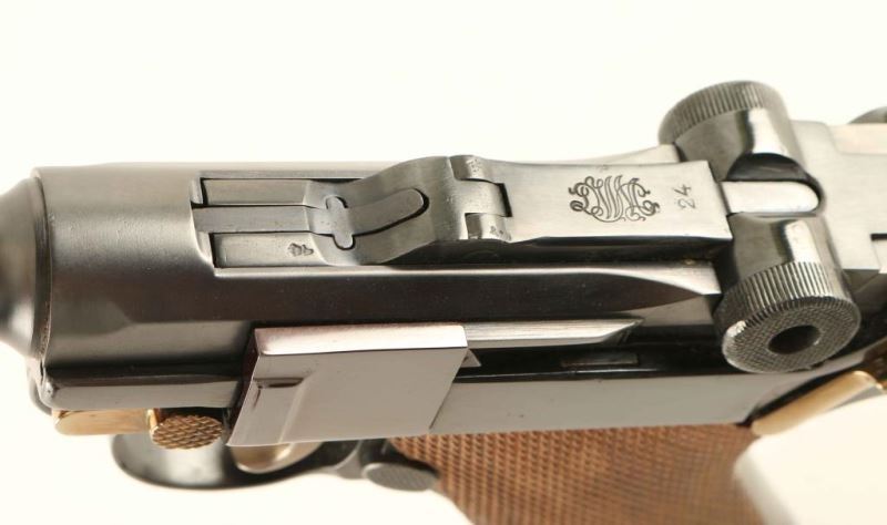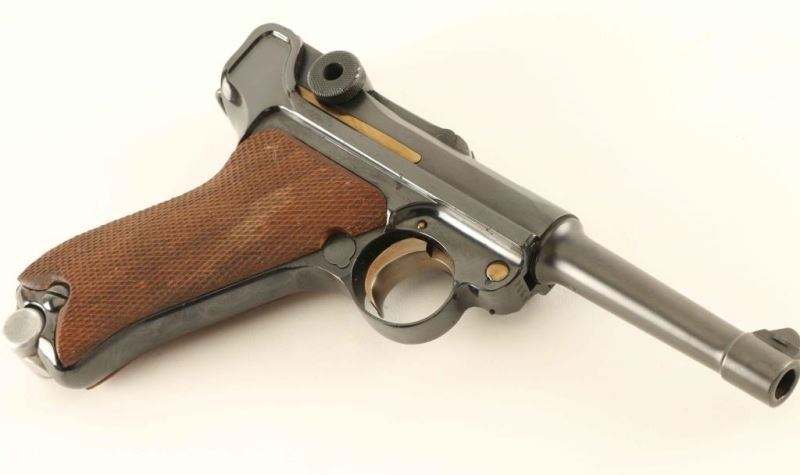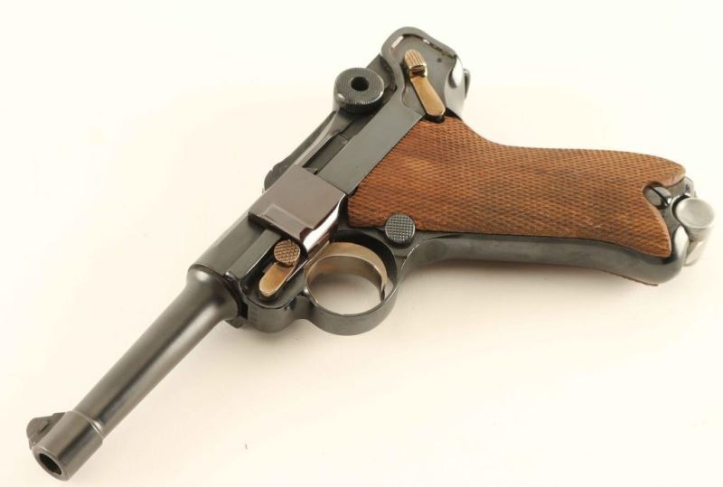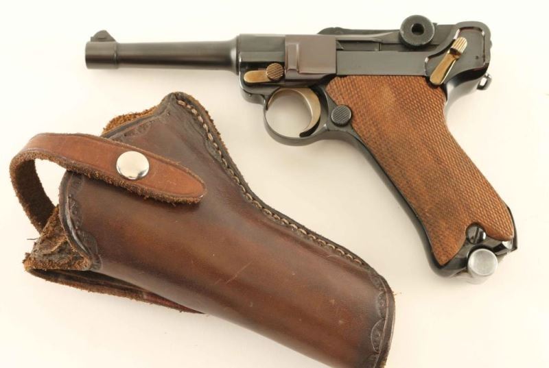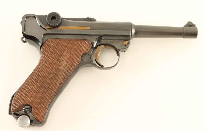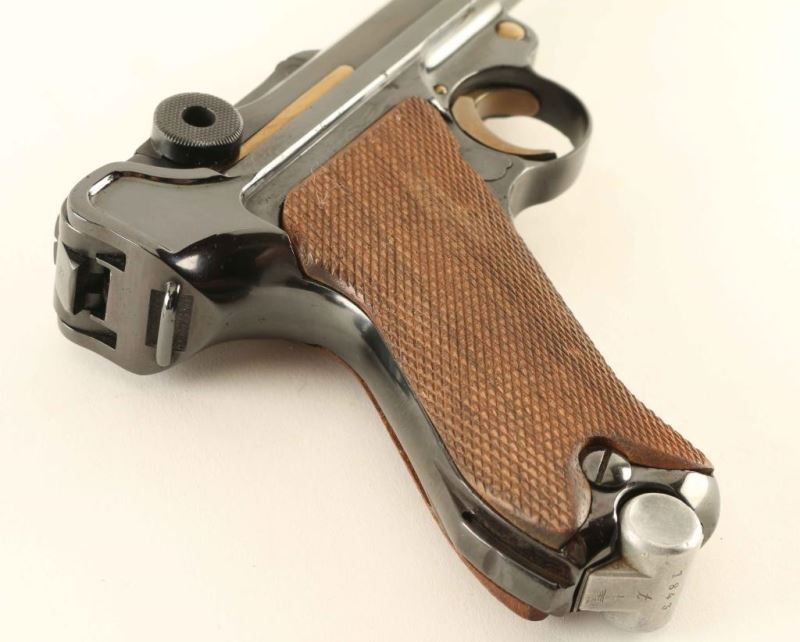 German made toggle locked recoil operated semi-automatic pistol chambered in 9mm Parabellum. Features a blued finish with straw colored small parts, 4" nitro proofed barrel, inverted 'v" front sight, 'v' notched rear sight, smooth crescent trigger, knurled charging knobs on the rear toggle link, manual safety, push button magazine release, 8 round blued steel magazine with aluminum base, steel frame with lanyard loop & provisions for a shoulder stock and two-piece finely checkered wood grips. Only a few parts are serialized including the frame, sear bar, front toggle link, magazine and the rear toggle link, none of which are matching. Includes a lightly tooled brown leather belt loop holster with "RE" makers mark. The pistol displays approximately 90% of it's blued refinish overall but varies in color(the frame has a polished blued finish, the side plate is plum and the barrel & receiver have a matte blued finish) and shows some old pitting under the finish & light scattered surface rust on top. Action is strong, bore is excellent and the aftermarket wood grips are very good+. Condition is NRA Good+ as refinished. ***C&R Firearm***