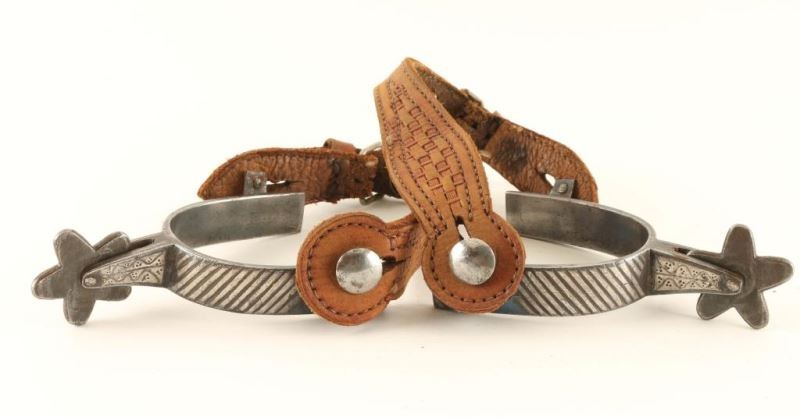 Inlaid silver design with leaf and line design. Star rowels with brown leather basketweave straps. Show use and wear.