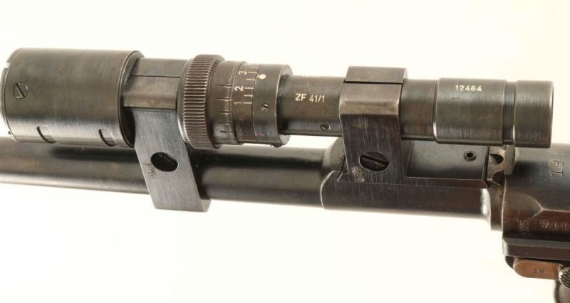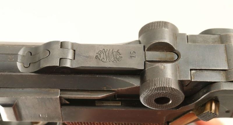 Interesting WWI era German military semi-automatic service pistol chambered in 9mm Parabellum, dated 1918. Features a blued finish, 8" barrel, shortened fine-tune inverted 'V' front sight, "dow" code(Opticotechna) ZF 41/1 1.5x scope utilizing a barrel band & the rear sight dovetail for mounting, push button magazine release, 8 round blued steel magazine with wood base(not numbered), crescent trigger, manual safety, steel frame with lanyard loop & provisions for a shoulder stock and two-piece finely checkered walnut grips. All serial numbers match with the exception of the magazine & scope. The pistol bears all the correct military proofs for it's time of production and also shows a "MA" monogram over a circled swastika proof on both of the scope mounts & on the receiver. According to Charles Keyton Jr.'s book "Lugers At Random" the "MA" monogram proof is the Mauser Arbeiten proof or "Mauser Reworked" proof that has been noted on a very few 1930-1933 reworks. The circled swastika could well be an indication that this firearm was purchased by a German officer during World War II. Includes a board stock with unmarked metal and an attached period black leather double magazine pouch. Pistol retains approximately 80% of it's original finish showing holster wear and some finish thinning to patina. Action is crisp, the bore is excellent, optics are fair and the wood grips are very good with minor blemishes & some worn points. Condition is NRA Very Good++. ***C&R Firearm***