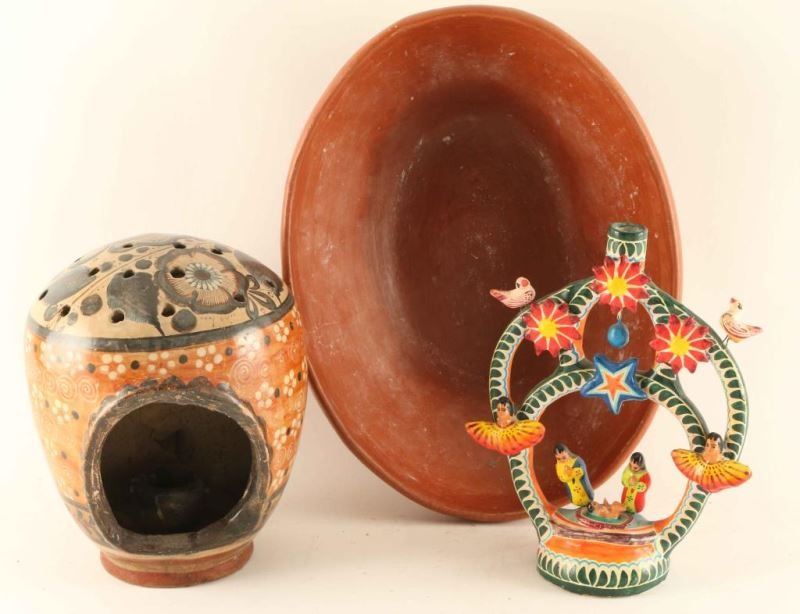 Including; Ceramic manger nativity scene painted in bright colors with candle holder on top measures 7"x5"x8 3/4", Zia 20th century red clay candle sconce with handle painted with floral motif in black, brown and white measures 7"x4", and an oblong red clay bowl measures 13"x10"x3 1/2".
