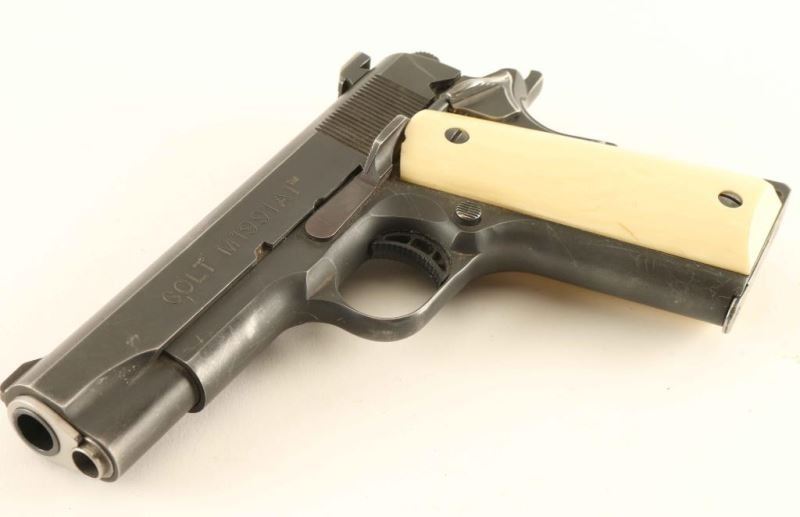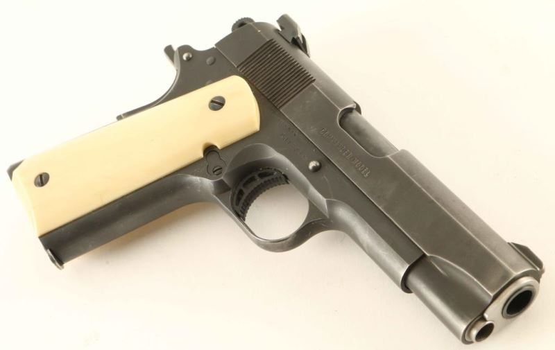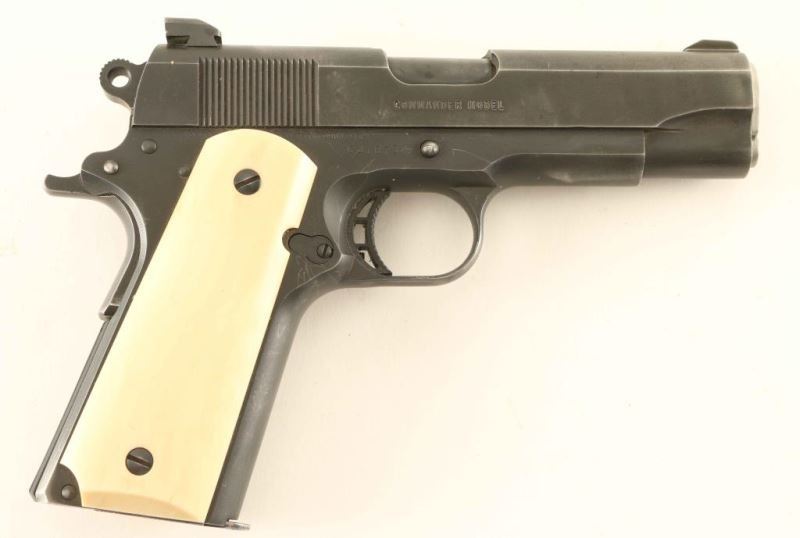 'Commander Model' Modernized 1911-A1 style single action semi-automatic pistol chambered in .45 Auto, circa 1990's. Features a matte blued finish, 4.25" barrel, low profile front sight with orange accent, dovetailed rear sight, textured nylon trigger, serrated round hammer spur, full-length steel guide rod, extended slide release, thumb safety, grip safety, push button magazine release, factory 7 round magazine, serrated flat black nylon mainspring housing and two-piece faux ivory plastic grips. Pistol exhibits approximately 85% of it's original finish showing moderate handling wear. Action is smooth, bore is pristine and the plastic grips are near fine with a small loss on the top of the left panel. Condition is NRA Very Good. ***Modern Firearm***