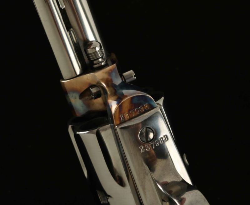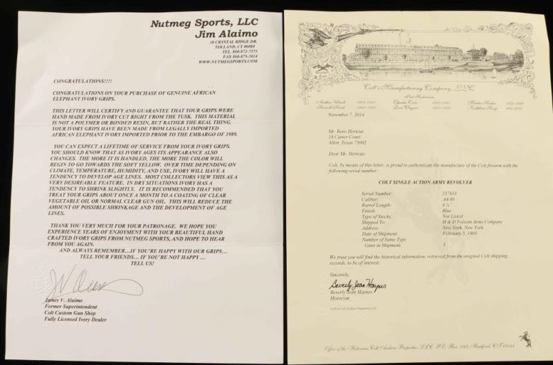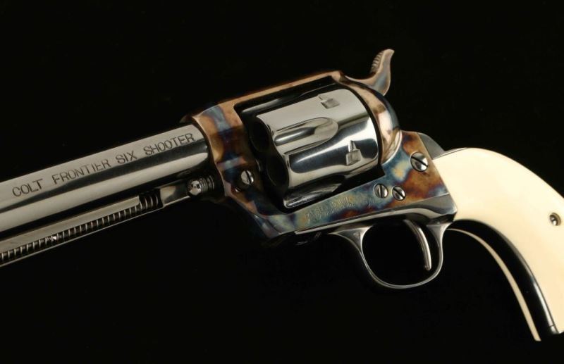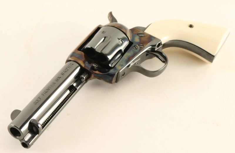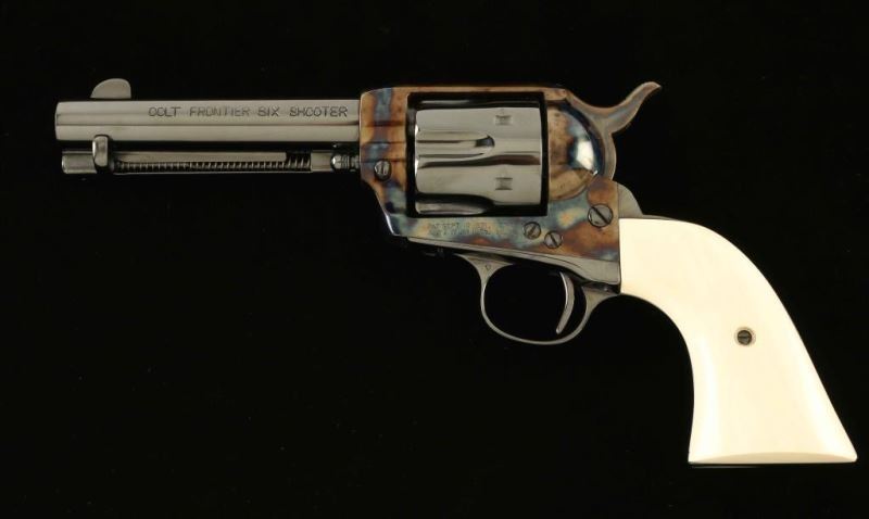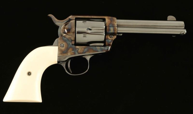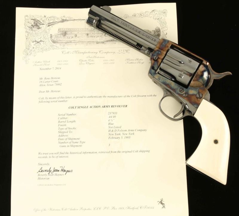 SN: 237933 Exquisitely restored vintage single action revolver chambered in .44-40 Winchester, manufactured circa 1902. This revolver has been fully and finely restored by the renowned Turnbull Restoration Company. Features a bright polished blued & vivid case hardened finish, 4 3/4" barrel with two-line address, ejector rod, blade front sight, 'v' notched rear sight, smooth trigger, knurled hammer spur, fluted six-shot cylinder, and two-piece pre-ban ivory grips from Nutmeg Sports. Includes a Colt factory letter confirming it's current configuration as original and stating that it was shipped February 5, 1903 to H & D Folsom Arms Company in New York, N.Y. in a three gun shipment. Revolver exhibits approximately 99%+ of it's beautiful restored finish showing no signs of use or wear. Action is untested, the markings are crisp, the bore is near good and the pre-ban ivory grips are fine. Condition is near NRA Perfect as restored. ***C&R Firearm***