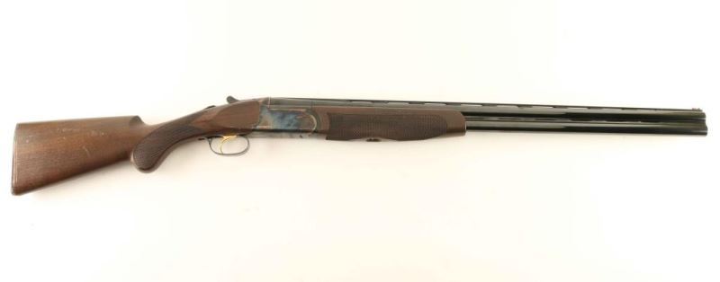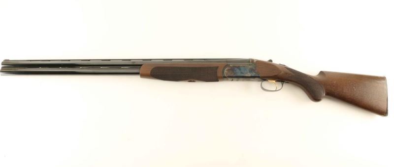 Italian made over/under double barrel boxlock shotgun chambered for 2 3/4" or 3" 12 gauge shells, manufactured circa 2014. Features blued 28" barrels with ventilated ribs, ejectors, red fiber optic front sight, gold single trigger, tang mounted automatic safety with barrel selector, case hardened receiver with acid etched floral scroll & border engraving, knurled top lever, checkered A-grade Turkish walnut forend with satin finish and prince-of-whales shoulder stock with Browning buttplate & 13 1/8" LOP. Includes the original factory hard case with manual and full & cylinder chokes. Shotgun exhibits approximately 95% of it's original finish showing light scattered handling marks and a small spot of finish loss on the right side of the forend metal near the receiver. Action is tight, bores are excellent and the wood stocks are good as the butt has been cut very poorly. Condition is Good to Very Good. ***Modern Firearm***