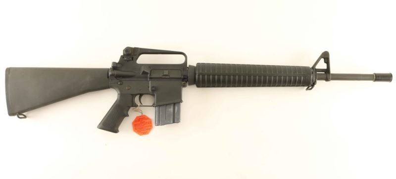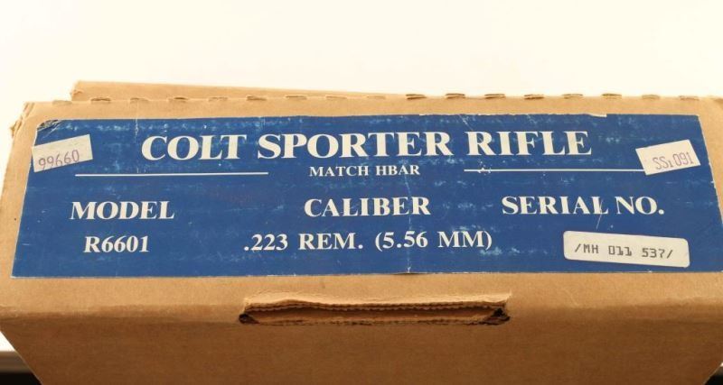 'Pre-Ban, Model R6601' Desirable semi-automatic AR platform target rifle chambered in 5.56mm NATO. Features a matte dark grey finish, 20" HBAR barrel with 1:7 twist, A2 bird cage style flash hider, adjustable A2 post front sight without bayonet lug, dual aperture adjustable rear sight in the carrying handle, dust cover, shell deflector, forward assist, standard charging handle, 'half-moon' bolt carrier, manual two position selector, push button magazine release, factory 20 round steel magazine, slab-side lower receiver, sling swivels, rifle length black composite handguard, A2 style pistol grip, and fixed shoulder stock with trap door buttplate. Includes the original factory cardboard box with blue label, manual, cleaning brushes, cleaning rod, sling, spare magazine and a black plastic muzzle cap. Rifle exhibits only light handling marks/scuffs and still retains the paper rod in the barrel from the factory. Action is strong, bore is presumably excellent, and stocks are fine. Likely unfired. Condition is near NRA Perfect in box. ***Modern Firearm***