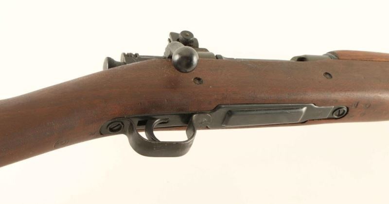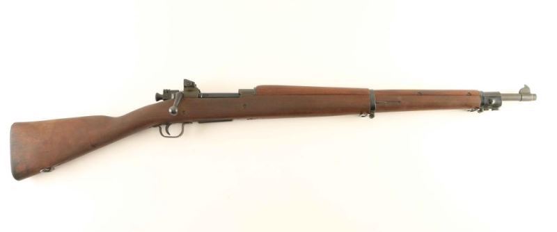 Late production U.S. Military contract bolt action service rifle chambered in .30-06 Springfield, manufactured circa 1944. Features a parkerized finish with some blued parts, 24" barrel marked "RA/[flaming bomb]/9-43", raised blade front sight, adjustable rear aperture sight, bayonet lug, two barrel bands, 5 round internal box magazine with stamped metal floorplate, three-position safety on the bolt, magazine cut-off switch, smooth trigger, sling swivels, smooth full-length walnut handguard and straight grip shoulder stock with knurled trapdoor metal buttplate. The stock is marked with a "P", circled "P", "RA", [crossed cannons], "OG", "FJA" in box cartouche, circled "20", "u" in triangle and an "A" in box. Rifle exhibits approximately 90% of it's parkerized & blued finish showing light wear, some handling marks and a small amount of surface rust on the trigger guard. Action is smooth, bore is excellent and the wood stocks are very good. Condition is NRA Very Good++. ***C&R Firearm***