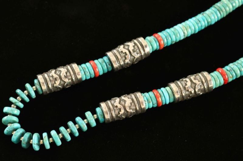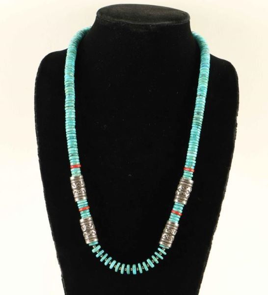 Features the extraordinary color and matrix of Arizona stones. The blue to blue-green finished discs are accented with apple coral, silver balls and four overlaid sterling barrels add additional Navajo artistry to this design. It's about 26" long with lobster clasp and is Sterling crafted by Tom and strung by Lula Begay. Hallmarked and stamped 'Sterling'.