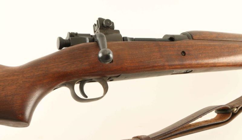 Late production U.S. Military contract bolt action service rifle chambered in .30-06 Springfield, manufactured circa 1944. Features a parkerized finish with some blued parts, 24" barrel marked "SC/[flaming bomb]/8-43", raised blade front sight, adjustable rear aperture sight, bayonet lug, smooth trigger, three-position safety on the bolt, 5 round internal box magazine, magazine cut-off switch, smooth brown leather G&K sling dated 1918, smooth full-length walnut handguard and pistol grip shoulder stock with knurled trapdoor metal buttplate & no visible markings. It is missing the front barrel band with sling swivel, the front of the stock has been shortened by approximately .5" and the trigger guard/floorplate is from a 1903. Includes an additional 'C' stock that has been stripped. Rifle exhibits approximately 80% of it's arsenal refinish showing handling marks, wear and heavy finish loss on the bottom metal. Action is smooth, bore is excellent, and wood stocks are good. Condition is NRA Good+. ***C&R Firearm***