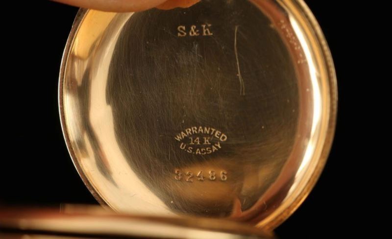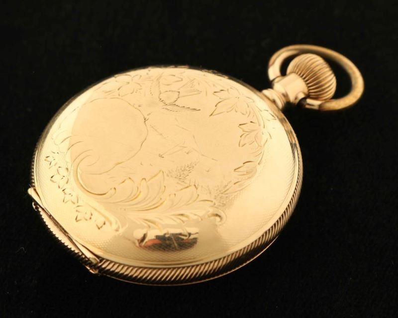 Model 1857, 14K Yellow Gold case, P.S. Bartlett Grade, Serial Number 5365584, in working condition with engraved landscape scene on both sides of the case.