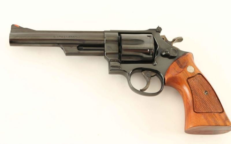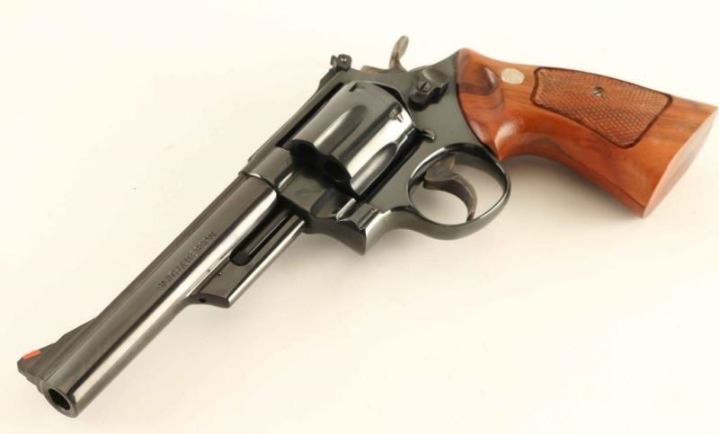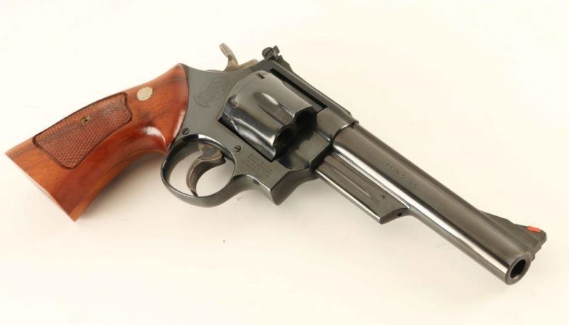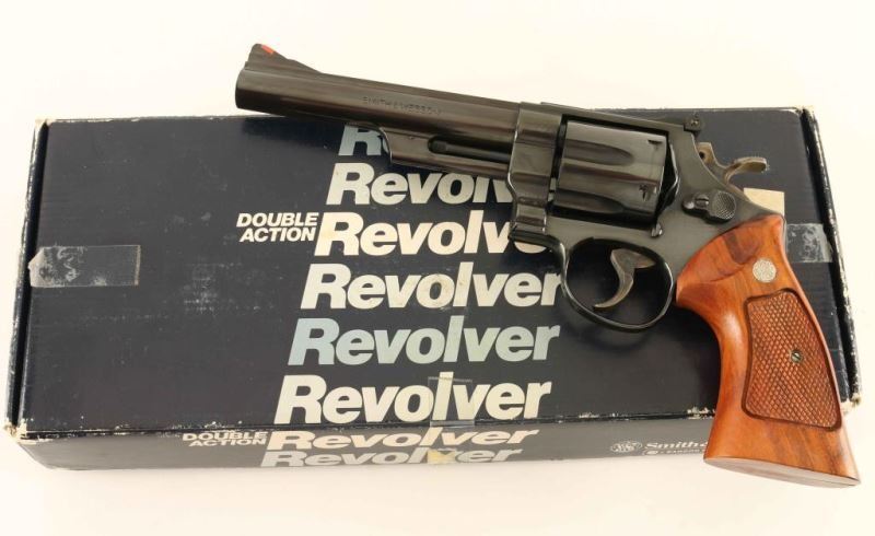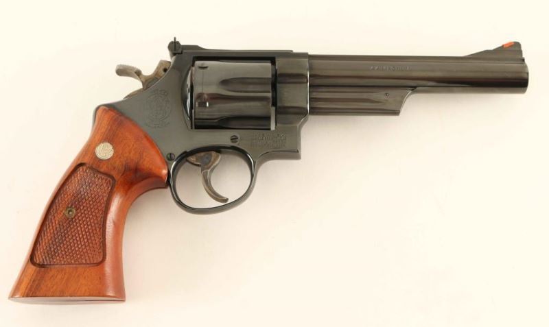 Large frame double-action revolver chambered in .44 Magnum, circa 1982-1983. Features a blued finish, 6" ribbed barrel, shrouded ejector rod, raised ramp front sight with orange insert, micrometer click rear sight with white outline, fluted six-shot cylinder, .400" target trigger, .500" target hammer, square butt N target frame and two-piece checkered walnut target grips with silver S&W medallions. Includes the original factory cardboard box with documents. Revolver exhibits approximately 99% of it's original finish with only a faint drag line on the cylinder observed. Action is smooth with very good lock-up, bore is pristine and wood grips are fine. Condition is near NRA Perfect in box. ***Modern Firearm***