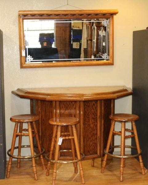 Oak construction with a rounded hexagon front, molded panels and a brass kickplate. Top of bar comes off to reveal a green felt surface to play cards. Measures 67"l x 34"w x 41 1/2"h. Includes 3 oak stools with brass footrails that measure 30"h x 19"dia. and a wide oak framed mirror with overhead racks for storing wine glasses. Frosted geometric design on mirror. Measures 52"l x 30"h x 10"w.