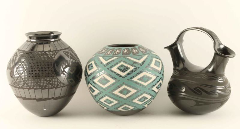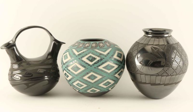 Including; black on black hand coiled Mata Ortiz wedding vase measures 7"hx6 3/4"w, black on black Mata Ortiz hand painted eye dazzler jack rabbit design measures 7"hx6"w, and a hand painted Mata Ortiz eye dazzler design pot measures 5 3/4"hx6 1/2"w.