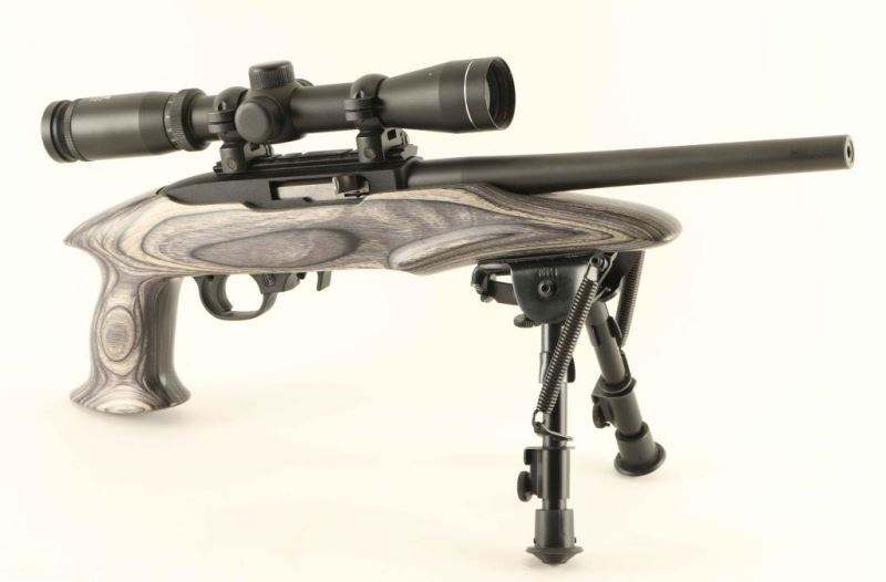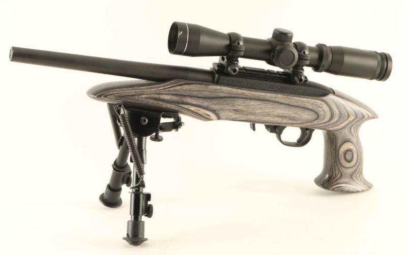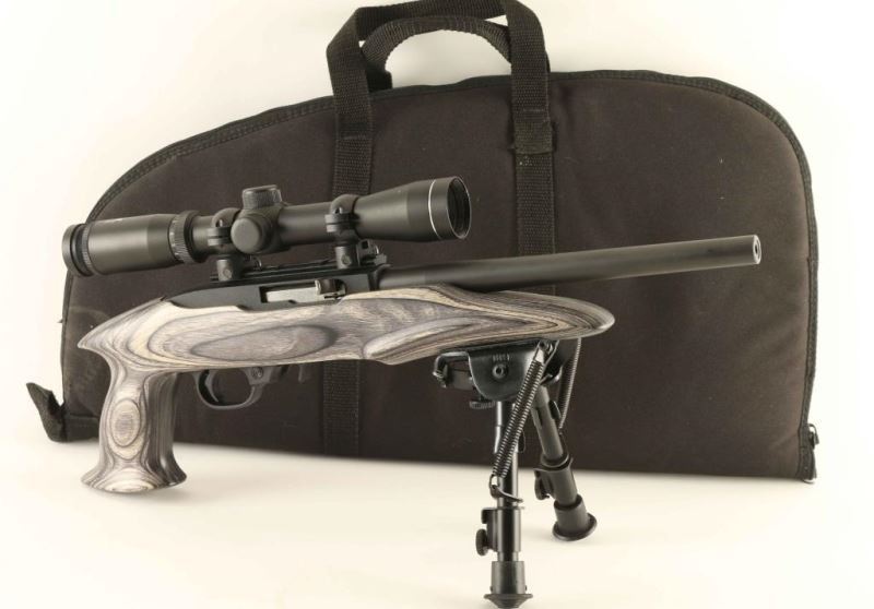 Pistol variation of the magazine-fed semi-automatic 10/22, chambered in .22 Long Rifle and manufactured circa 2009. Features a matte blued 10" barrel with no provisions for sights, NcStar 2-7x 32mm scope with illuminated reticle, adjustable bipod, factory 10 round rotary magazine, push button safety, smooth charging handle, textured trigger, black crinkle finished aluminum receiver, and one-piece smooth grey laminated wood pistol grip stock. Includes a black nylon padded soft case with a large pocket. Pistol exhibits approximately 99%+ of it's original finish showing few minor handling marks with no major wear observed. Action is smooth, bore is excellent, optics are sharp and the wood stock is fine. Condition is near NRA Perfect in case. ***Modern Firearm***