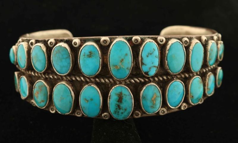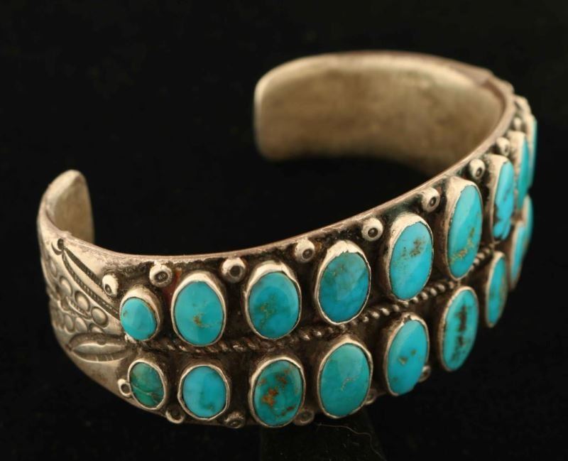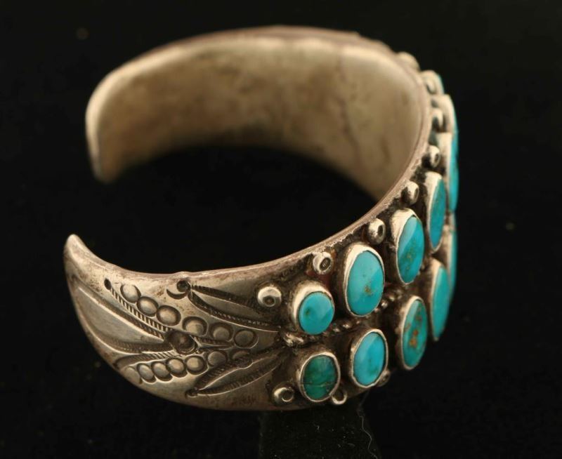 Two rows of oval turquoise in graduating sizes set in a solid sterling silver cuff with rope and bead design. End of tapered cuff is stamped with a floral motif. Measures 1 1/8" wide and 2 5/8" opening inside. Very nice.