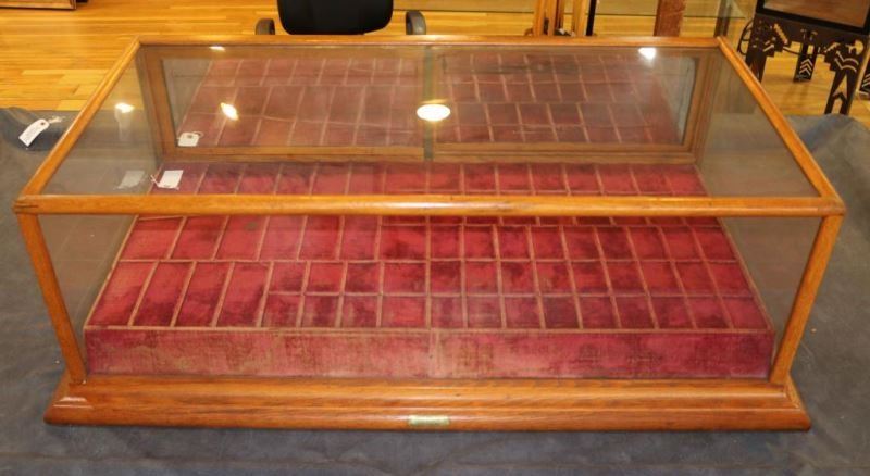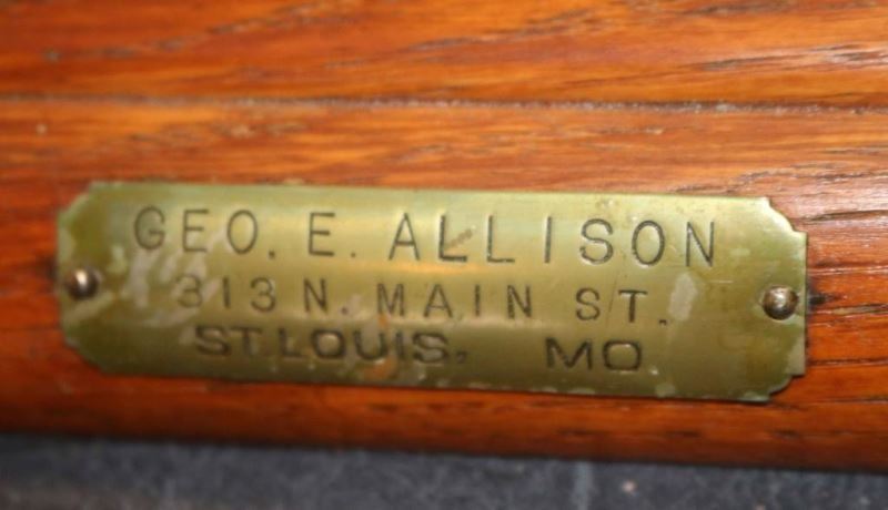 Oak framed case with glass front and sides with rear sliding doors and drawers with brass pulls. Interior of case is lined with red velvet with several sections for product that is worn due to age and use. Front has a brass plaque that reads 'Geo E. Allison, 313 N Main St, St. Louis MO'.
