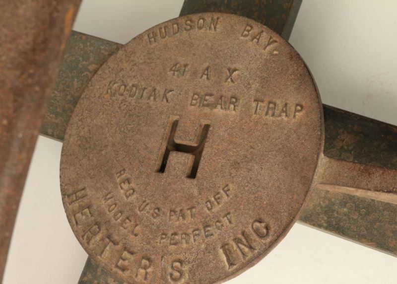 All metal construction marked 'Hudson Bay 41 AX Kodiak Bear Trap, Reg US Pat. Off. Model Perfect, Herter's Inc.' Nice rusty patina measures 43 1/2"l x 10 1/2"h (closed).