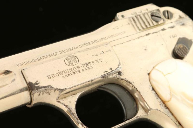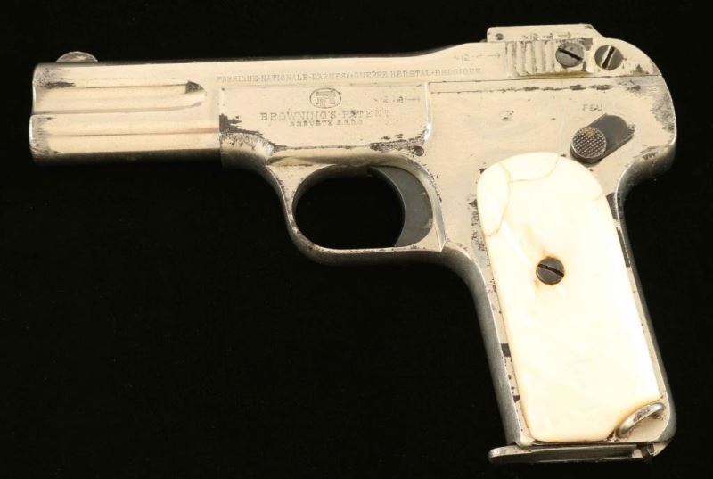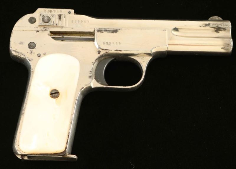 'Old Model' Vintage Belgium made striker fired semi-automatic pistol chambered in 7.65mm, manufactured circa 1900-1910. Features a nickel plated finish, 4" barrel, round blade front sight, 'v' notched rear sight, cocked indicator, smooth trigger, manual safety, heel magazine release, 7 round magazine and two-piece mother-of-pearl grips. Pistol exhibits approximately 80% of it's nickel plated finish showing scratches, some cloudiness and scattered losses with pitting in the void. Action performs well, bore is excellent and the mother-of-pear grips show repair to the left panel. Condition is NRA Good. ***C&R Firearm***