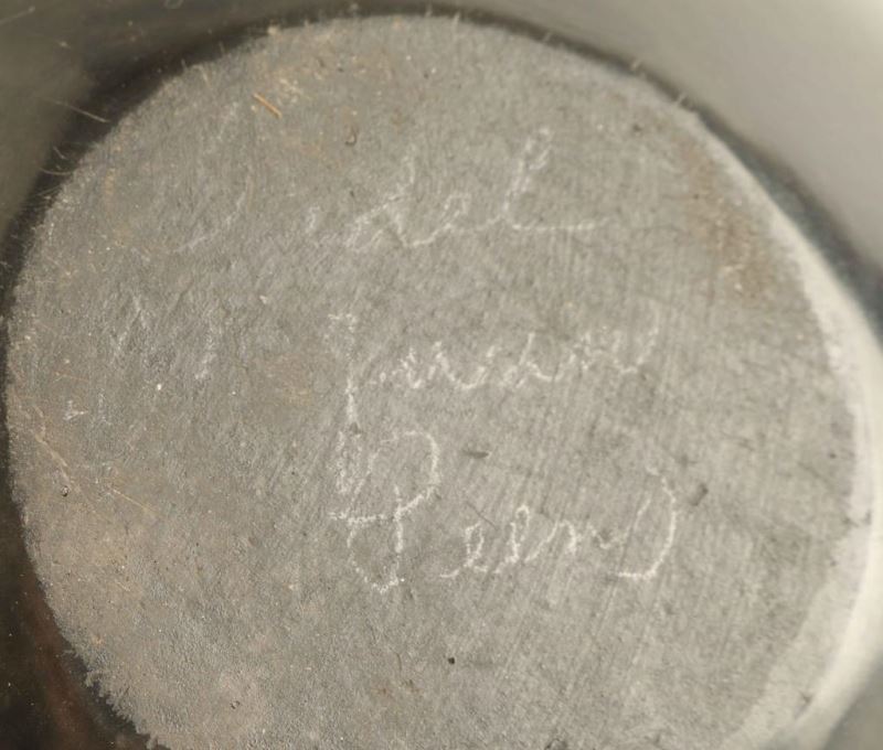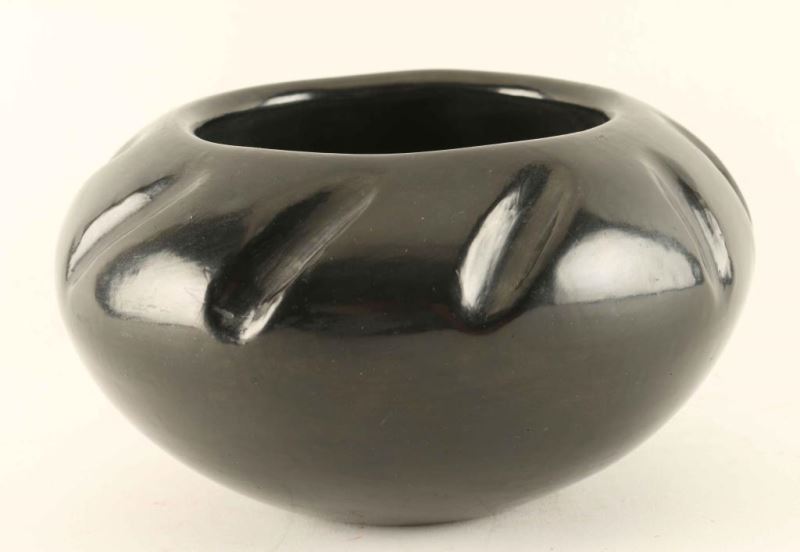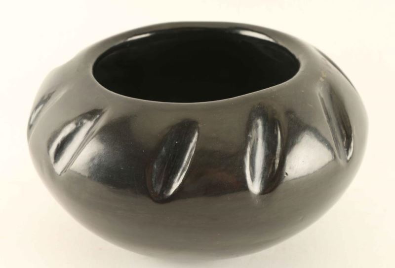 Heavy bowl with indents on outer rim. Signed by artist on bottom, measures 7 1/2"x4". Finish has worn away in one small area by rim.