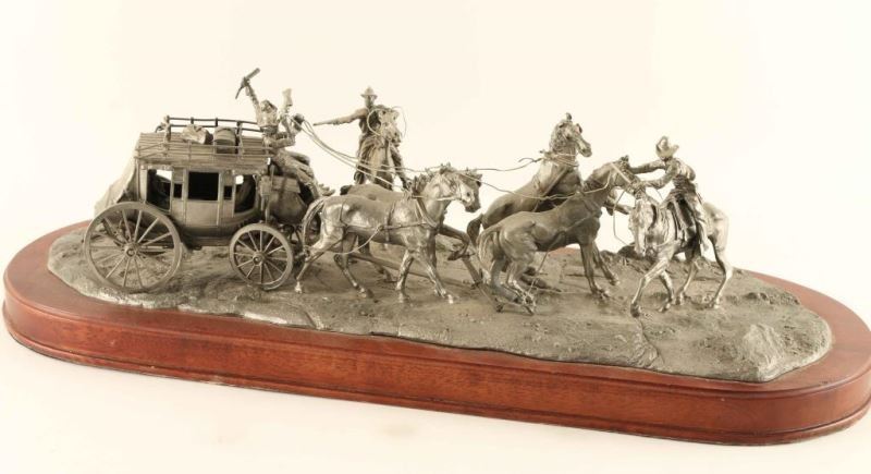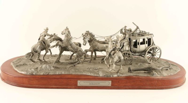 Western Heritage Museum "Hold Up!" depicting a stagecoach being held up by two men on horseback with rifles. Pewter on wood base with felt padding, measures 22"l x 8 1/2"w x 7"h.