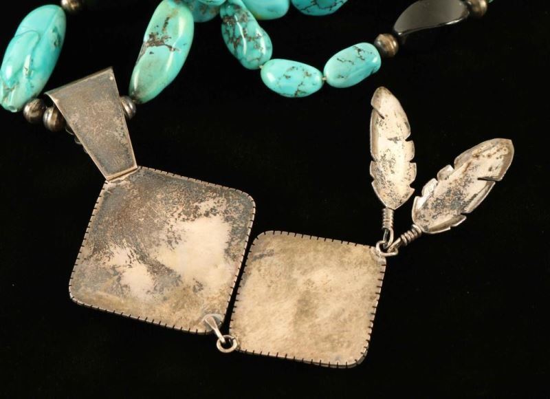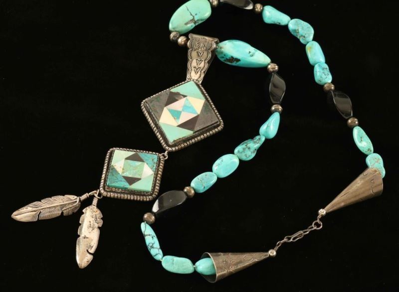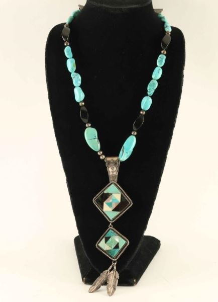 Natural turquoise stones mixed with obsidian and sterling silver beads with large pendant of two inlaid squares of turquoise, mother of pearl and obsidian set in sterling silver with large stamped bezel and feather dangles