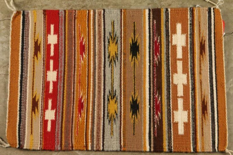 Woven rug with eye dazzler and cross pattern in gold, tan, red, brown, gray and white. Beclahbeto Trading Post, NM by Connie Taylor. Good condition. Measures 15 1/2"x23".