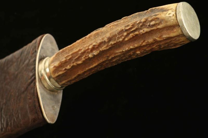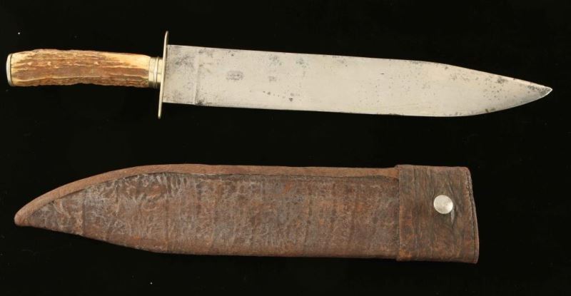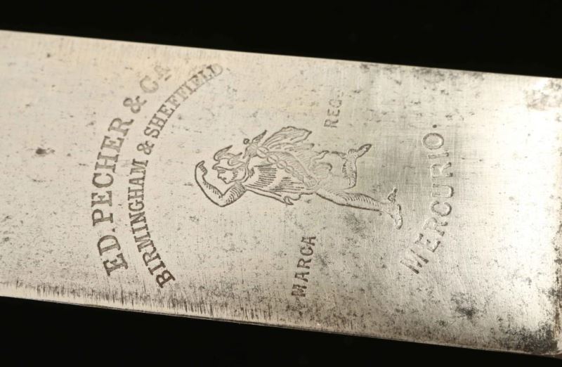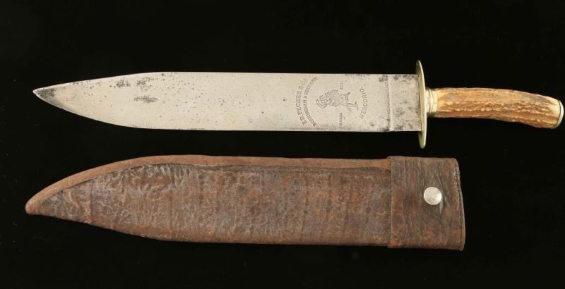 19th Century bowie knife marked 'Ed. Pecher & Co. Birmingham & Sheffield', with 'Mercurio' (Mercury) logo and trademark portrait of ancient Greek God. 13" blade with stag grip and German silver mounts. Original thick leather scabbard with button hanger. 17 1/2" overall. Good condition with minor pitting, slight sharpening along with normal wear and use. South American or Mexican market during Frontier Era.