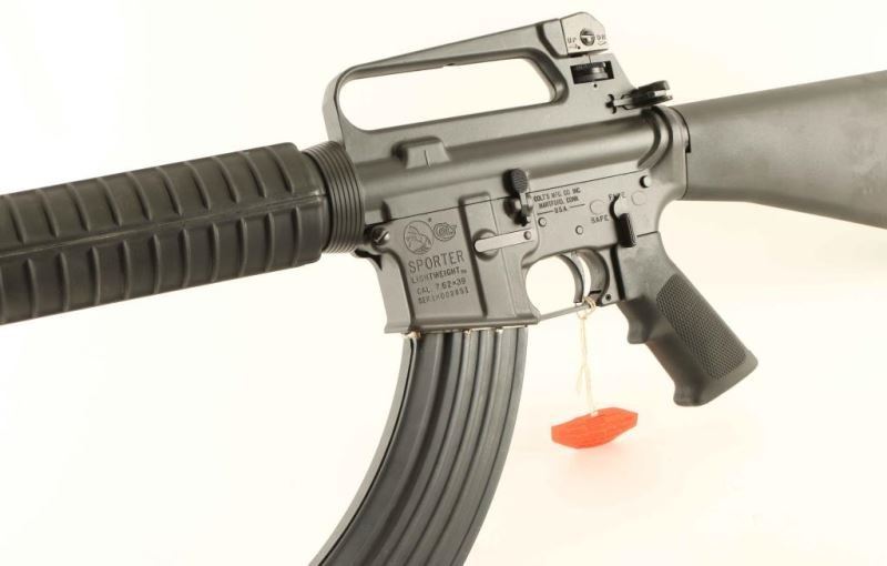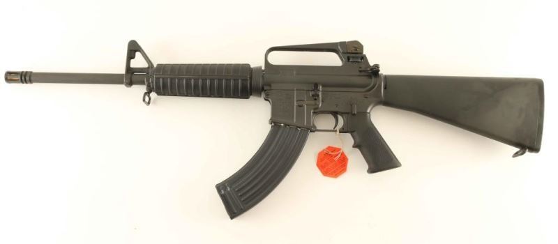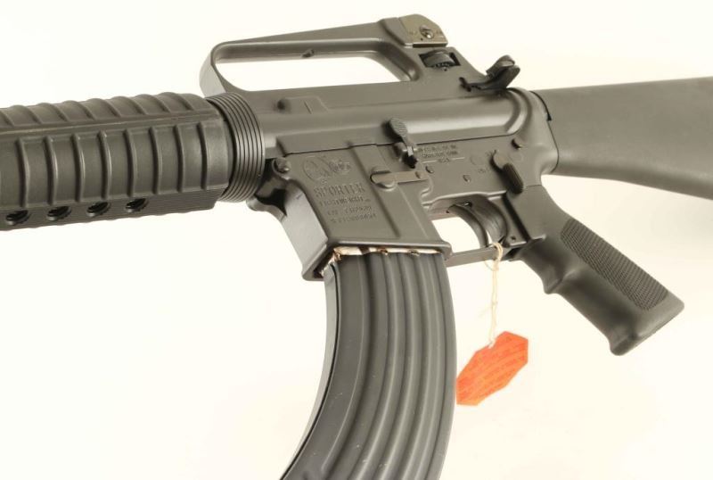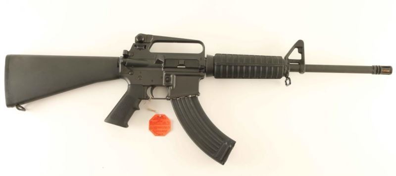 'Pre-Ban, Model R6830' Desirable semi-automatic AR platform sporting rifle chambered in 7.62x39mm. Features a matte dark grey finish, 16.25" barrel with 1:12 twist, A1 style bird cage flash hider, adjustable A2 post front sight without bayonet lug, dual aperture adjustable rear sight in the carry handle, dust cover, shell deflector, forward assist, standard charging handle, 'half-moon' bolt carrier, sear block, manual two position selector, push button magazine release, aftermarket 30 round steel magazine, sling swivels, carbine length black composite handguard, A2 style pistol grip, and A2 fixed shoulder stock with trap door buttplate. Includes the original factory cardboard box with blue label, manual, cleaning brushes, sling, and two factory 5 round magazines. Rifle exhibits few light handling marks and still retains the paper rod in the barrel from the factory. Action is strong, bore is presumably excellent, and stocks are fine. Likely unfired. Condition is near NRA Perfect in box. ***Modern Firearm***