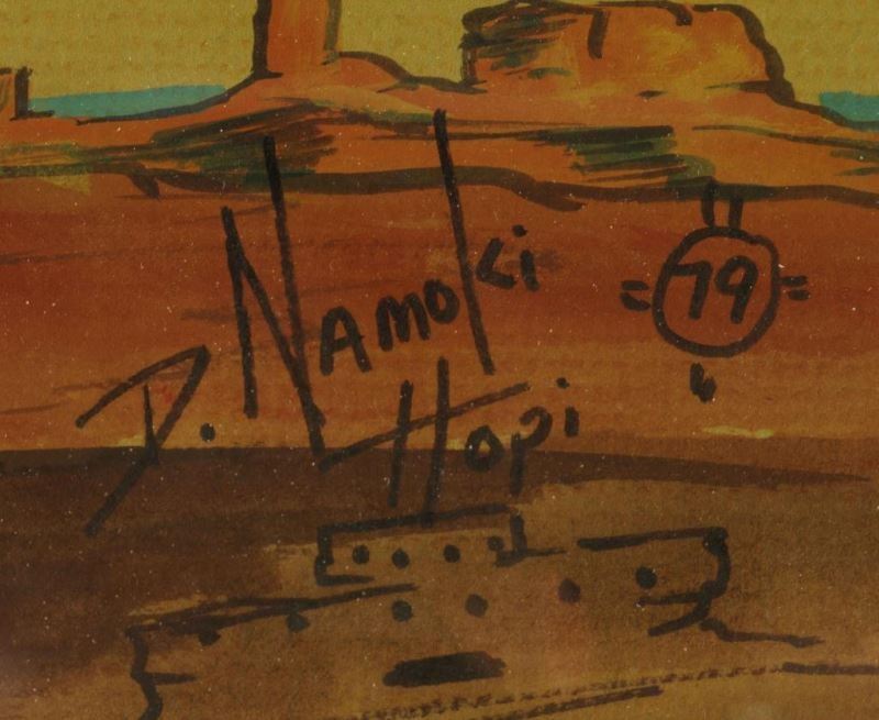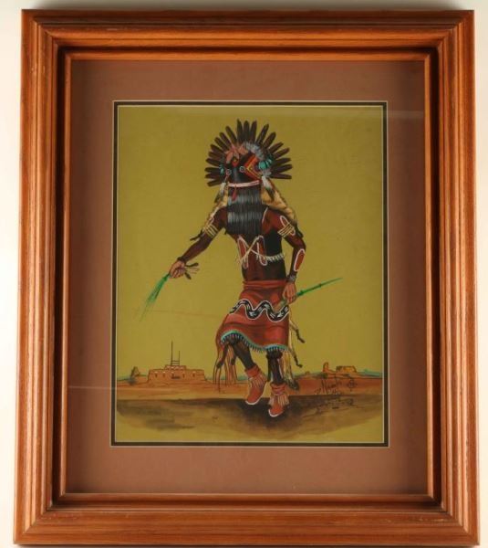 Depicting a Hopi Kachina Dancer in desert setting signed lower right. Image measures 15 1/2"x19 1/2" with double mat and heavy wood frame.