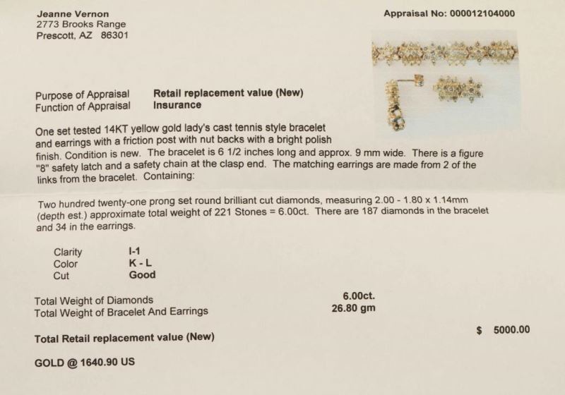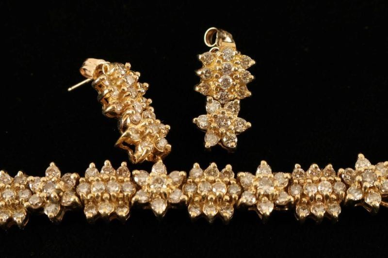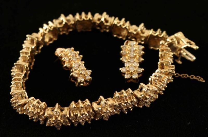 Yellow 14KT gold lady's cast tennis style bracelet and earrings with a friction post with nut backs with a bright polish finish. The bracelet is 6 1/2" long and approx. 9mm wide. There is a figure '8' safety latch and a safety chain at the clasp end. the matching earrings are made from two of the links from the bracelet. Containing 221 prong set round brilliant cut diamonds of I-1 clarity, K-L color. Approx total weight of stones 6.00ct. There are 187 diamonds in the bracelet and 34 in the earrings. Comes with papers