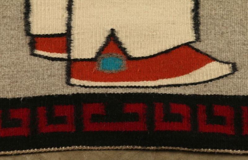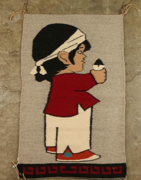 Standing Navajo boy holding a feather in black, white, red and blue on gray. Geometric border on the bottom in black and red. Measures 33"x20" good condition.
