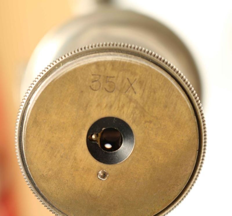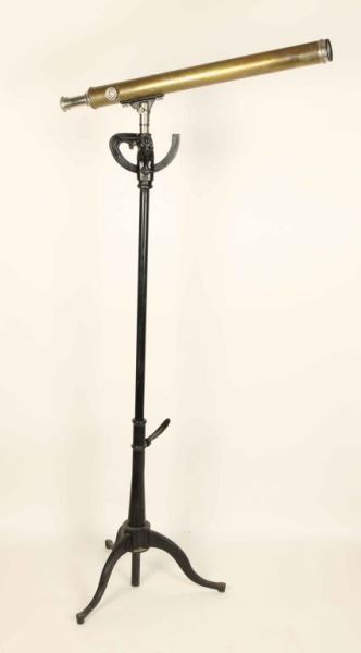 35x power brass telescope on adjustable black metal stand with three legs. Measures 60"h with a 29 1/2" x 2 1/4"dia scope.