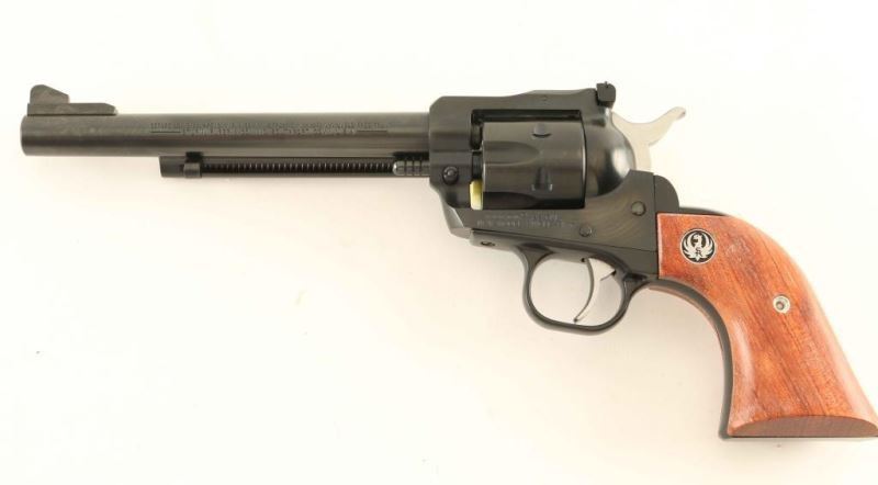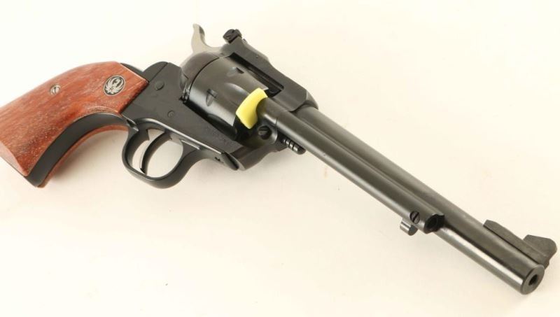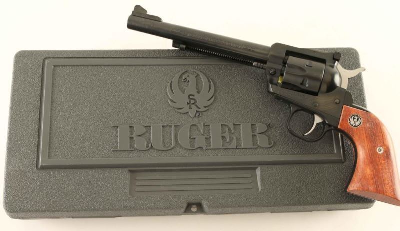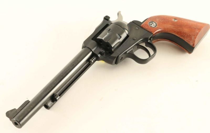 SN: 263-83096 American made small frame single action revolver with convertible cylinders chambered in .22 Long Rifle & .22 Magnum, circa 2000. Features a blued/black finish, 6 1/2" barrel, raised ramp front sight, adjustable rear sight, ejector rod, smooth trigger, serrated hammer spur, transfer bar safety, fluted six-shot .22 LR cylinder, and two-piece smooth wood grips with Ruger medallions. Includes the original factory hard case with manual, lock and an unfluted .22 Magnum conversion cylinder. Revolver no visible signs of use or wear. Action is smooth with very-good lock-up, bore is pristine and the wood grips are fine. Likely Unfired. Condition is NRA Perfect in case. ***Modern Firearm***