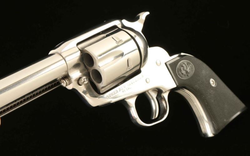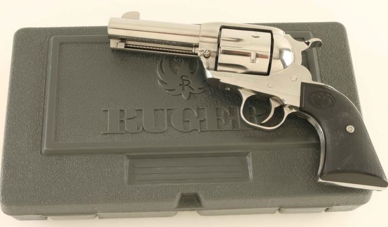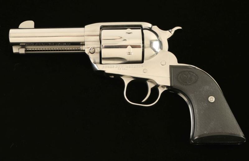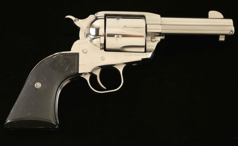 'Montado' Stainless steel single action revolver chambered in .45 Colt, circa 2007. The Montado was designed especially for cowboy mounted shooters. It features a hi-gloss finish, 3 3/4" barrel, blade front side, square notched rear sight, ejector rod with crescent shaped head, smooth trigger, knurled low wide hammer spur, transfer bar safety, fluted six-shot cylinder with beveled edges, scaled down frame, XR-3 grip frame with serrated front strap and two-piece checkered black plastic grips with Ruger insignias. Includes the original factory hard case with manual, lock, and spent case. Revolver exhibits a bright drag line on the cylinder and shows some light handling marks. Action is super smooth with very good lockup, bore is pristine, and the plastic grips are fine. Condition is NRA Excellent in case. ***Modern Firearm***