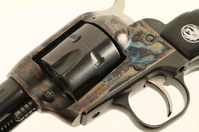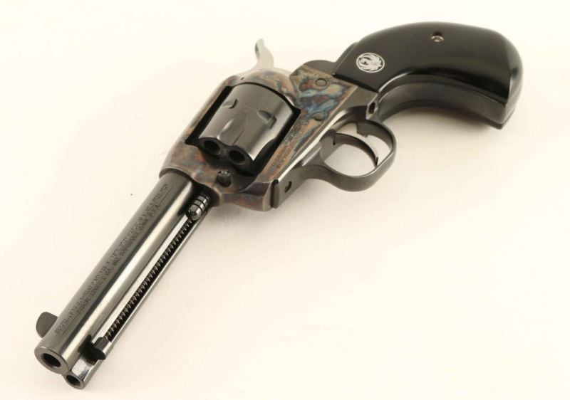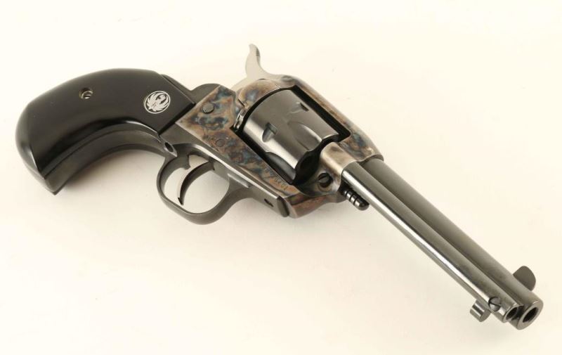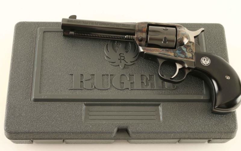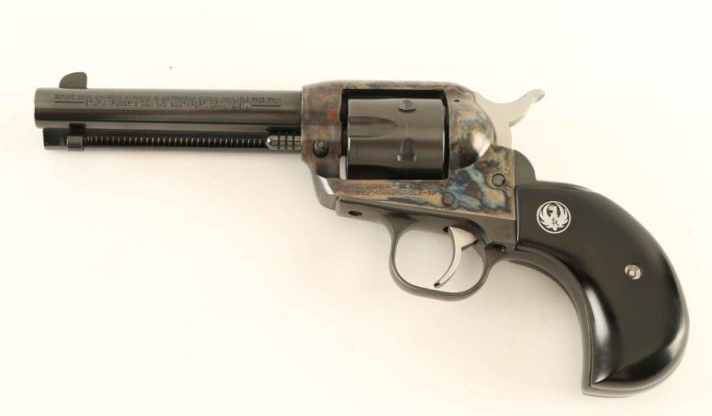 Sn: 650-40461 'SSM' Small frame single-action revolver chambered in .32 Harrington & Richardson Magnum, circa 2002. Features a blued & case hardened finish, 4 5/8" barrel, blade front sight, square notched rear sight, fluted six-shot cylinder, ejector rod, transfer bar safety, smooth trigger, serrated hammer spur, and smooth two-piece faux ebony birds head grips with Ruger medallions. Includes the original factory hard case with documents, lock and spent case. Revolver exhibits approximately 98% of it's original finish with only minor wear observed. Action is smooth with very good lock-up, bore is excellent, and composite grips are fine. Condition is NRA Excellent in box. ***Modern Firearm***