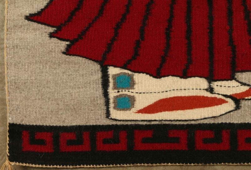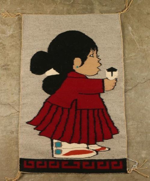 Standing Navajo girl holding a feather in black, white, red and blue on gray. Geometric border on the bottom in black and red. Measures 32 1/2"x21" good condition.