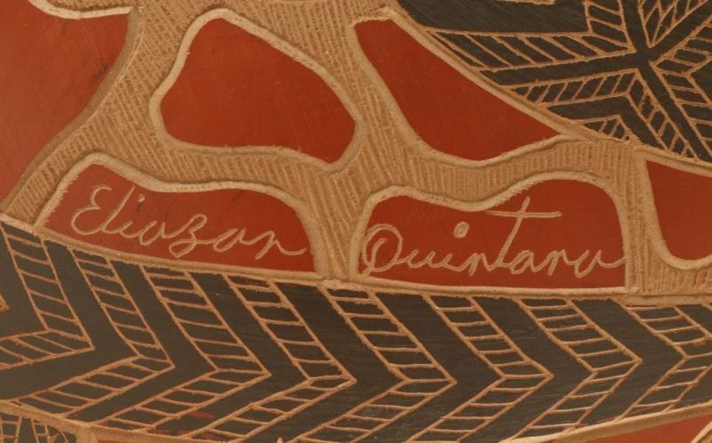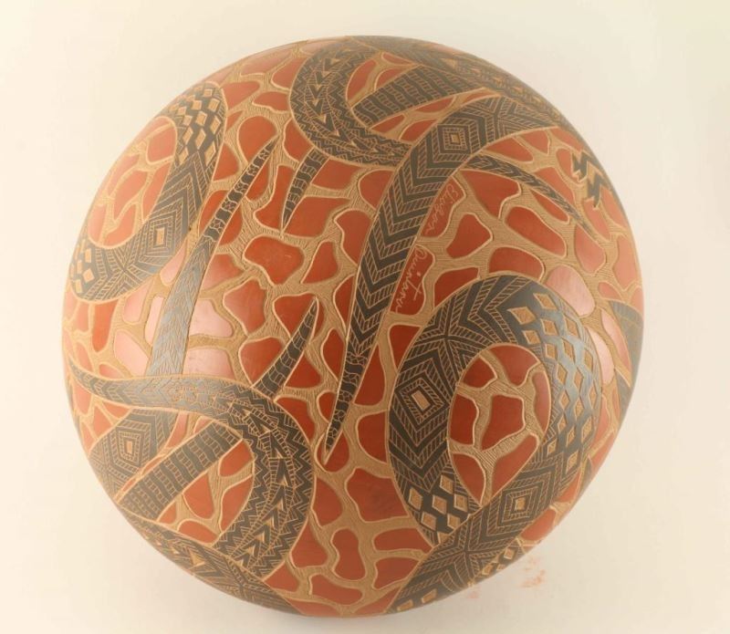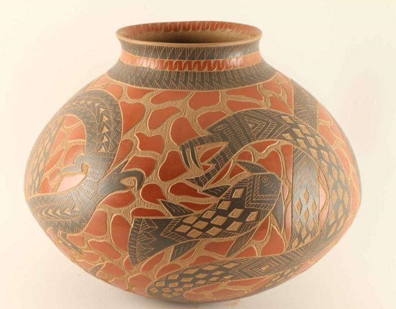 Polychrome pot with snake motif throughout signed 'Eliaban Quintana'. Measures 13"x16".