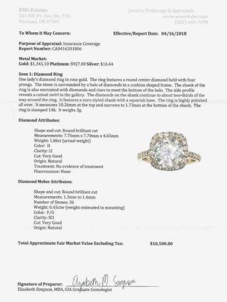 featured in a lovely halo setting featuring center diamond with H color and surrounded with 36 micro set 'IDEAL' cut accent diamonds with F-G-H colors and VS clarity set in 14K rose gold setting.