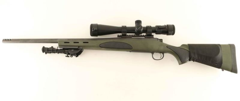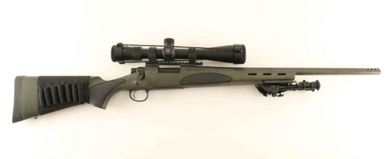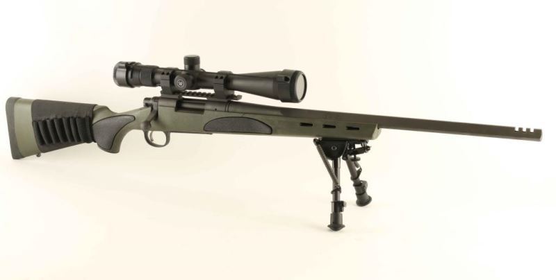 'Varmint Tactical Rifle' Quality American made bolt action sporting rifle chambered in .308 Winchester. Features a matte grey finish, 22" triangular barrel with integral compensator cuts & no provisions for sights, Vortex Viper 6.5-20x 44mm scope with Vortex rings & one-piece scope rail, Harris 1A2 Ultralight 6-9" bipod, smooth adjustable trigger with polymer trigger guard, internal box magazine with hinged polymer floorplate, manual safety on the right side of the receiver, swivel studs, slip-on cartridge carrier and olive drab green synthetic pistol grip shoulder stock with ventilated semi-beavertail forend, right handed cheek rest, textured rubber grip inserts & factory recoil pad. Rifle exhibits approximately 96% of it's original matte finish showing little wear and a small amount of emerging surface rust on the left side of the barrel. Action is very smooth, the bore is excellent, the optics are sharp and the composite stock is fine. Condition is NRA Very Good. ***Modern Firearm***