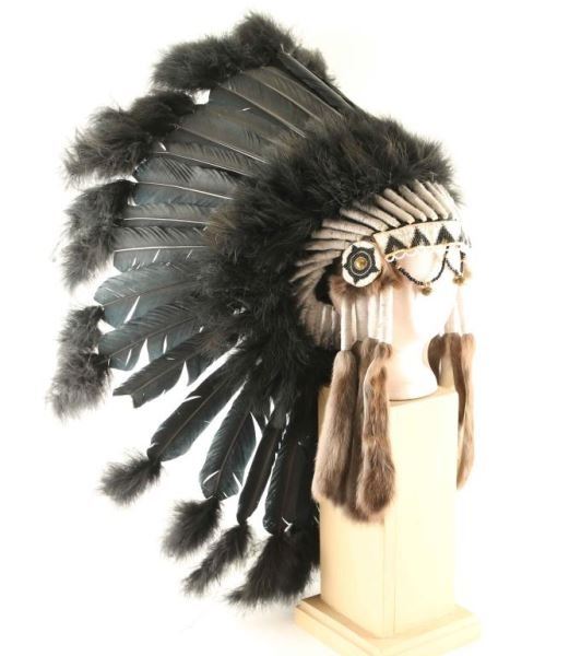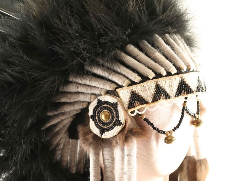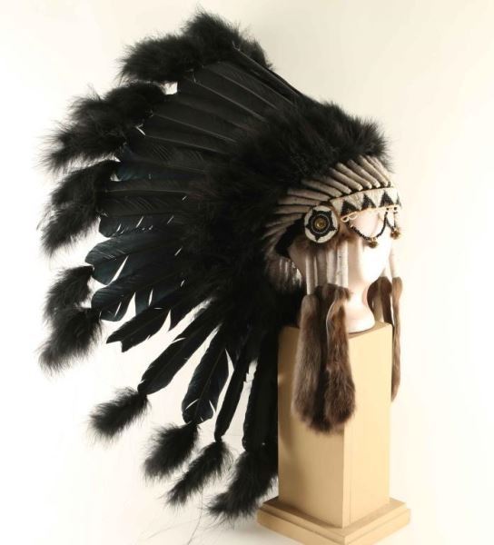 Large Black And White War Bonnet With Beaded Band With Triangles Accented With Bells And Fur Strips, Overall Very Good Condition