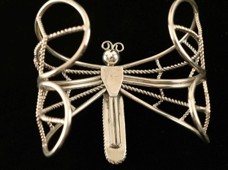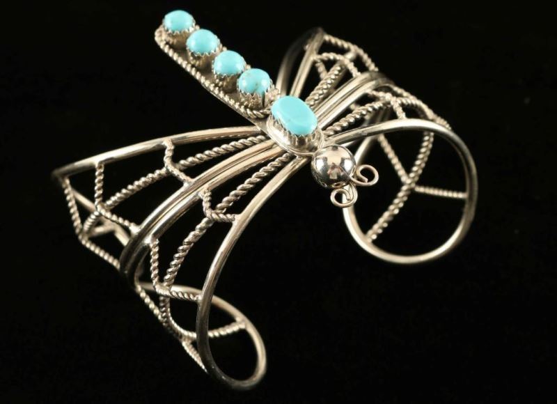 Navajo made with a delicate design of four small round cabs and one oval cab of turquoise for the body of the dragonfly. Outstretched wings go around the wrist. Pretty and delicate. Signed 'NC'. Measures 2 1/4"w, inside 2 3/8".