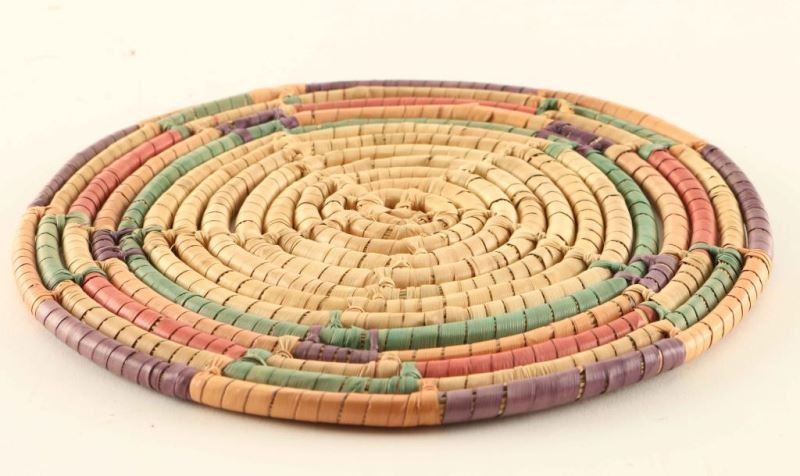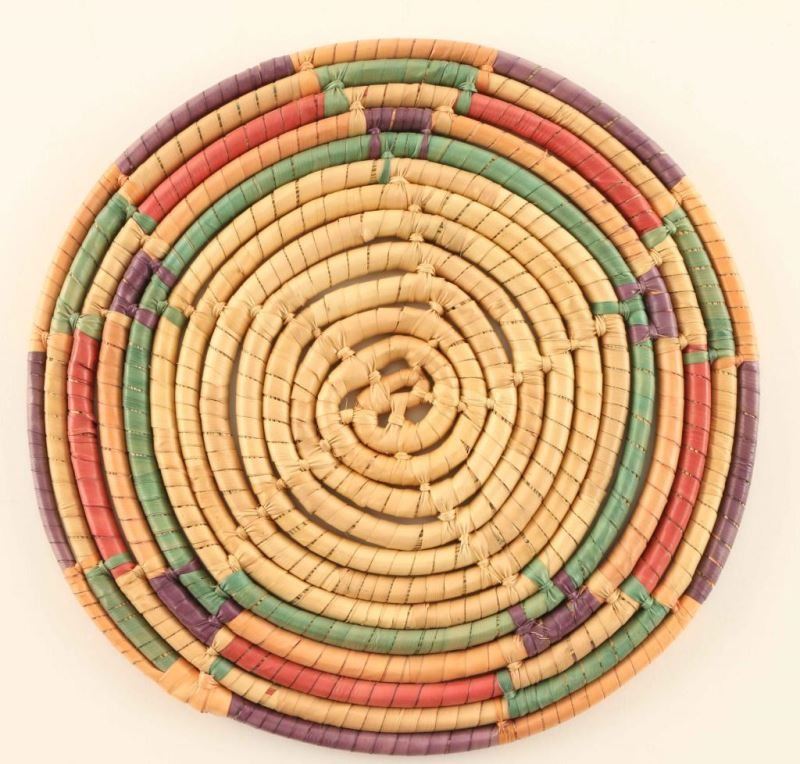 Red, green, purple and orange edged design on natural. Measures 7 1/2" good condition.