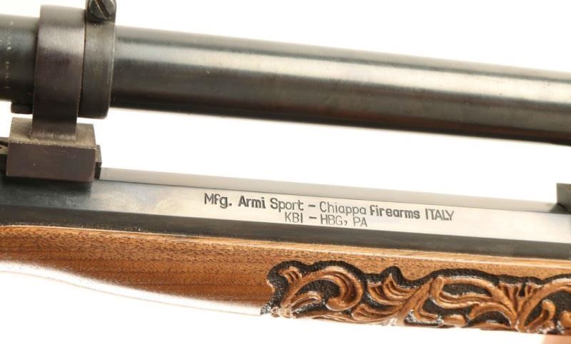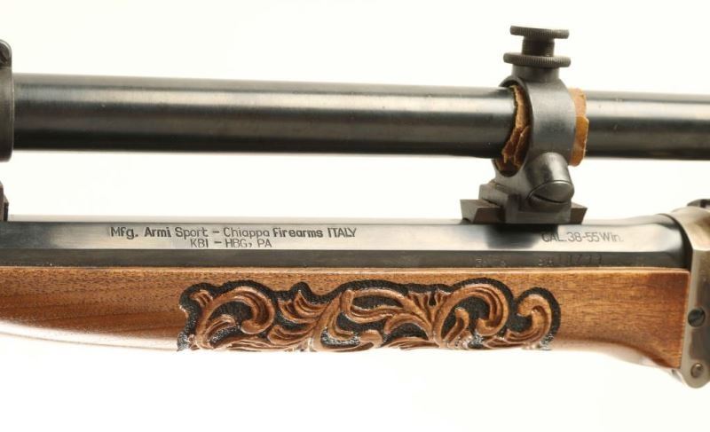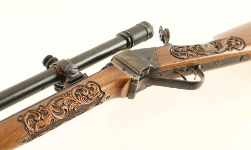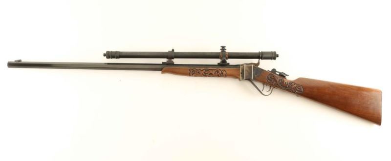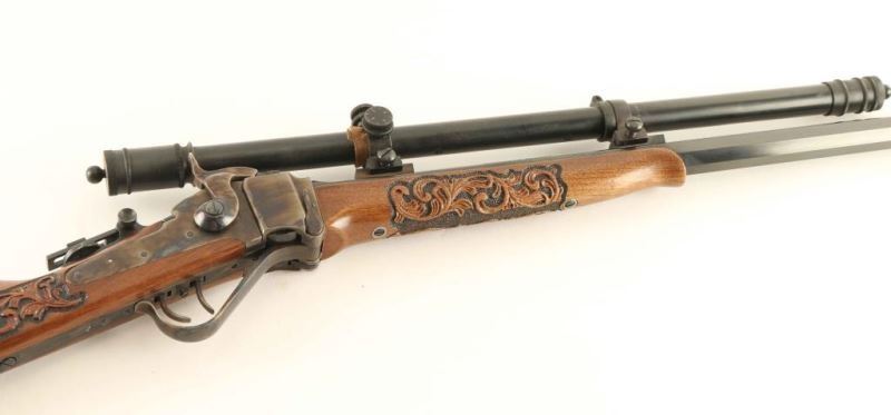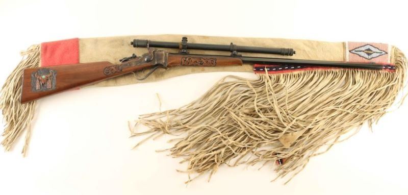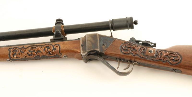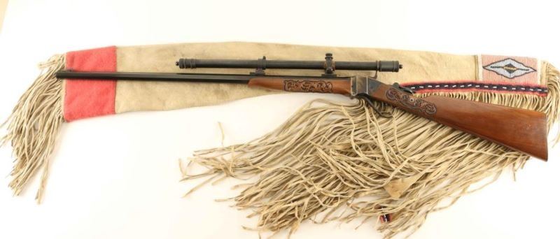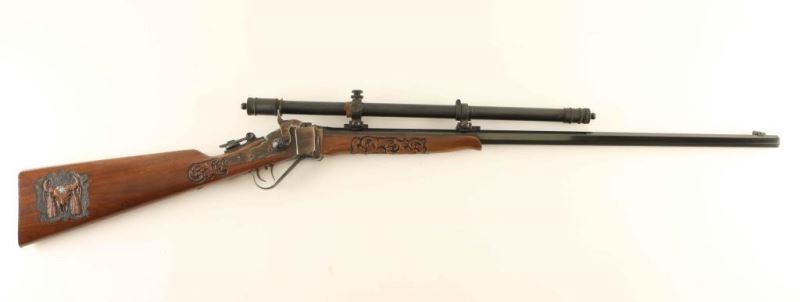 SN: SH10711 Italian made small scale reproduction of the Sharps falling block single shot rifle, chambered in .38-55 Winchester, manufactured circa 2008. Imported by K.B.I. of Harrisburg, P.A. and marketed by Charles Daly. Features a blued & case hardened finish, 26" octagonal barrel, dovetailed blade front sight, flip-up aperture tang sight, Wm Malcolm 6x scope with adjustable rings & screw in covers, double set triggers, walnut forend with hand carved floral scroll embellishment, and a straight grip shoulder stock with a turquoise inlaid carving of a Native American decorated steer skull, signed Jose Valencia 2010. Includes a beaded and fringed suede rifle scabbard by Travels Far Trading. Rifle exhibits approximately 99% of it's original finish showing little to no visible wear. Action is smooth, bore appears excellent but dirty, optics are clear and the wood stocks are fine. Condition is near NRA Perfect. ***Modern Firearm***