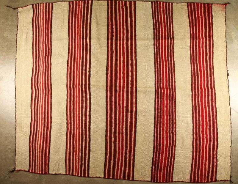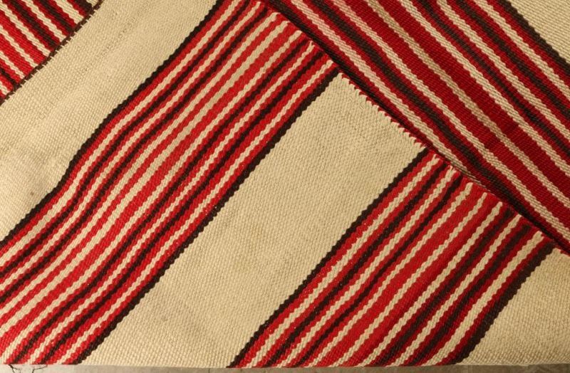 Five bands of horizontal red and black stripes. Measures 72 1/2" x 60 1/2". A few holes and weave is coming away at the top.
