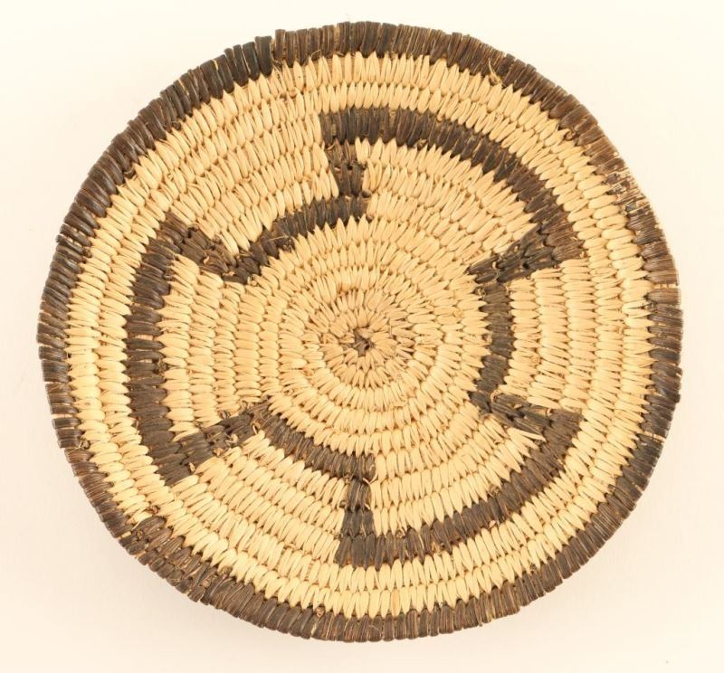 Small black and natural plaque with geometric design. Measures 5" dia. good condition.