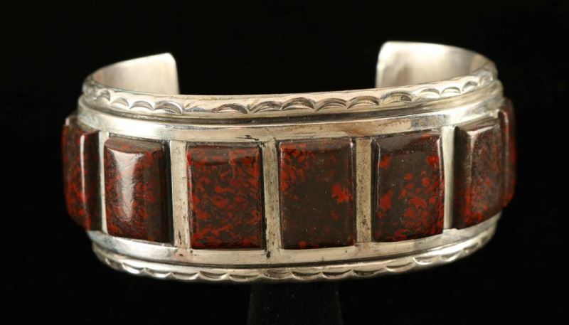 Wide 1" band of sterling holds eleven square pieces of bloodstone jasper. Inside measures 2 1/4". Very masculine piece. Unsigned.