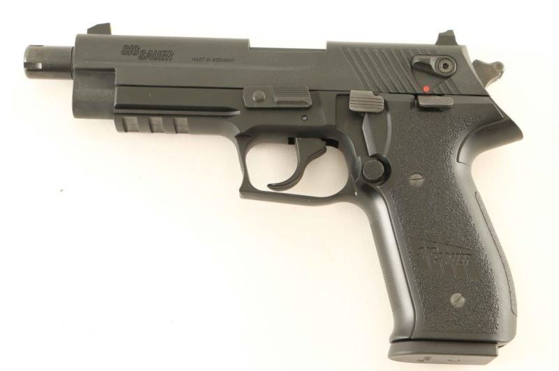 Double-action semi-automatic rimfire pistol chambered in .22 Long Rifle, manufactured in Germany by German Sport Guns GmbH circa 2011. Imported by Sig Sauer Inc. of Exeter, N.H. with import marks on the right side of the slide. Features a matte black finished aluminum-zinc alloy slide, 4.9" threaded barrel with screw on thread protector, high contract three-dot sights with drift adjustable rear sight, thumb decocker, ambidextrous safety on the slide, internal locking safety, smooth trigger, serrated round hammer spur, push button magazine release, factory 10 round steel magazine, black polymer frame with integral accessory rail and two-piece textured black synthetic grips with Sig Sauer decor. Includes the original factory hard case with manual, thread protector wrench, spare recoil spring, key and two additional front sights. Pistol exhibits only minor wear but the slide displays a grainy dark grey appearance rather than black. Action is smooth, bore is pristine and the plastic grips are fine. Condition is NRA Very Good++. ***Modern Firearm***