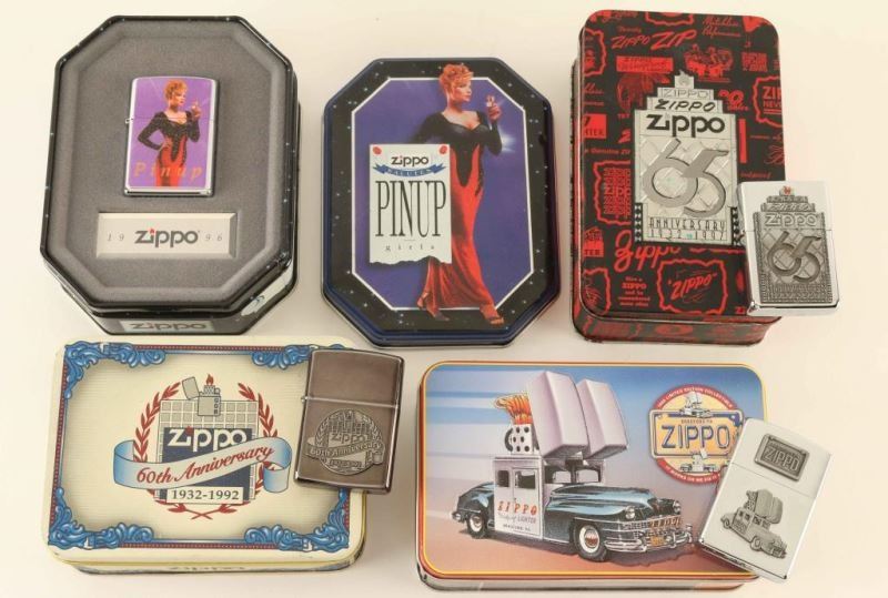 Includes 1996 Pinup Girls in tin, 60th Anniversary in tin, 65th Anniversary in tin and a Car & Key Chain Combo in tin. All like new unused.