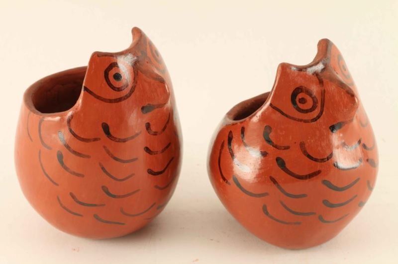 Red clay with black design, circa 1940s. Both measure 4"h x 3.5" approx. good condition.