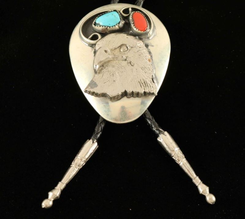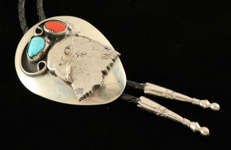 Lot 332a Navajo Turquoise, Coral & Nickel Bolo Tie